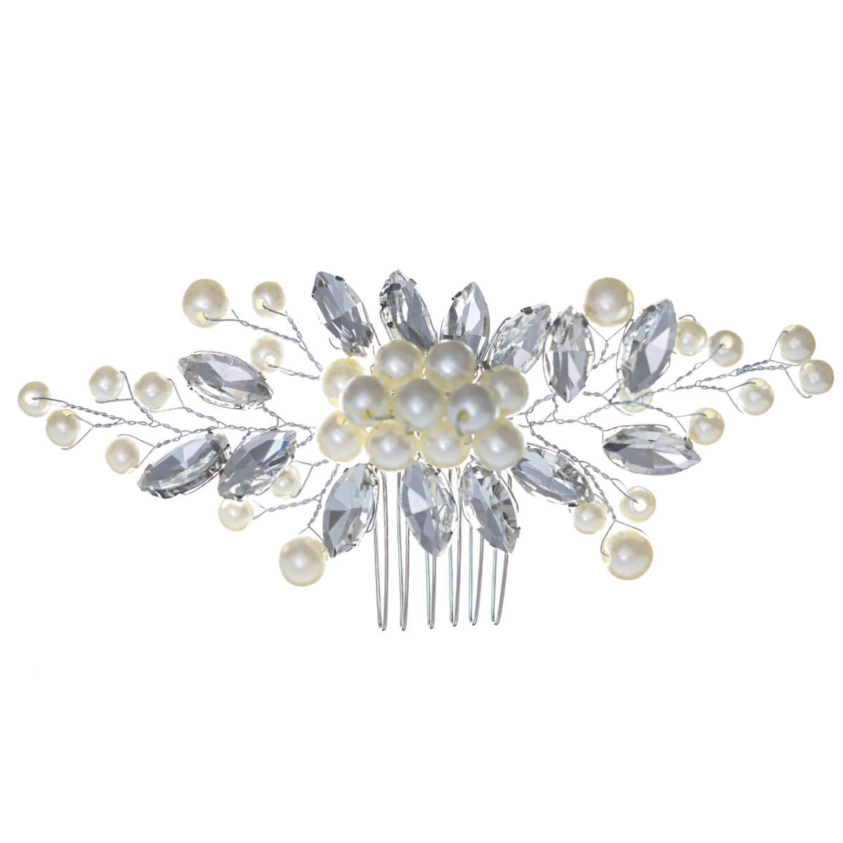 Helmi hiuskoru kampaukseen asettuu helposti paikoilleen kamman avulla. Muotoiltava metallinen punos on koristeltu muovihelmin ja markiisi lasikivin. Tämä hiuskoru viimeistelee elegantin ilmeen juhla- ja hääkampauksiin.