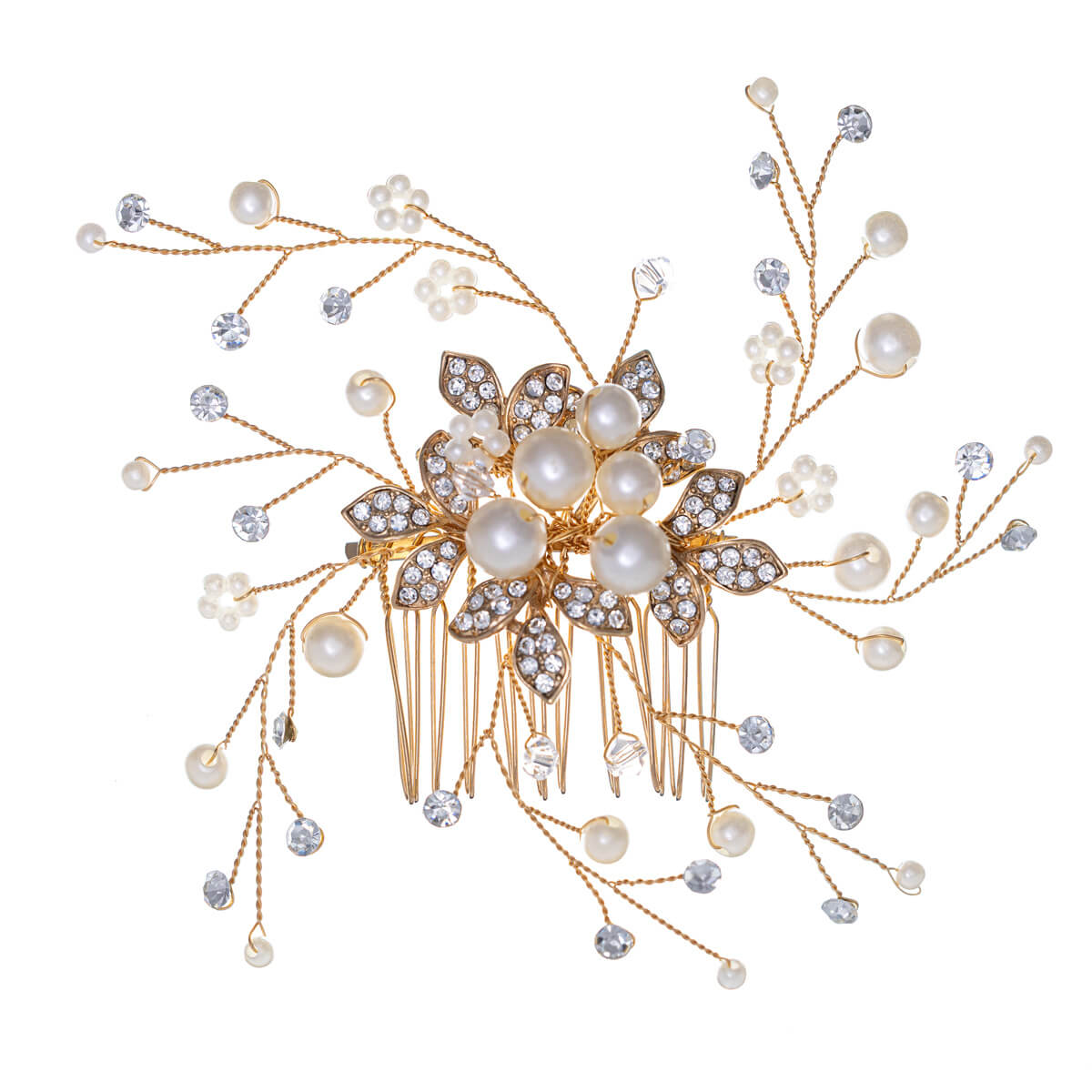 Helmi hiuskoru kampaukseen asettuu helposti paikoilleen kamman avulla. Muotoiltava metallinen punos on koristeltu muovihelmin ja markiisi lasikivin. Tämä hiuskoru viimeistelee elegantin ilmeen juhla- ja hääkampauksiin.