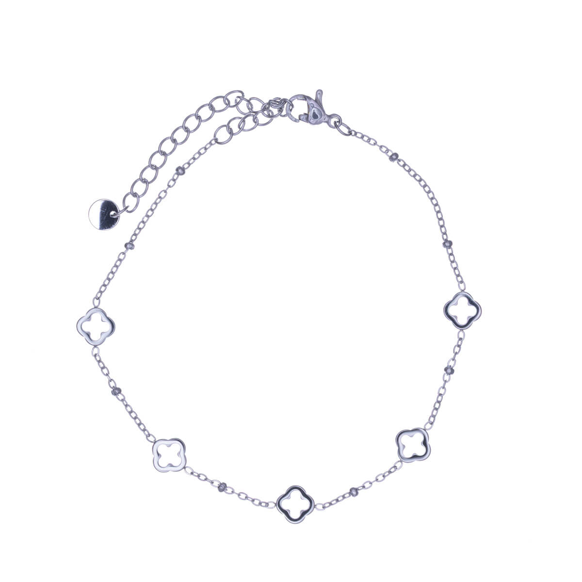 Ohutta ranneketjua koristaa kukkakuvioiset koruosat. Rannekoru on kokonaan kirurginterästä.