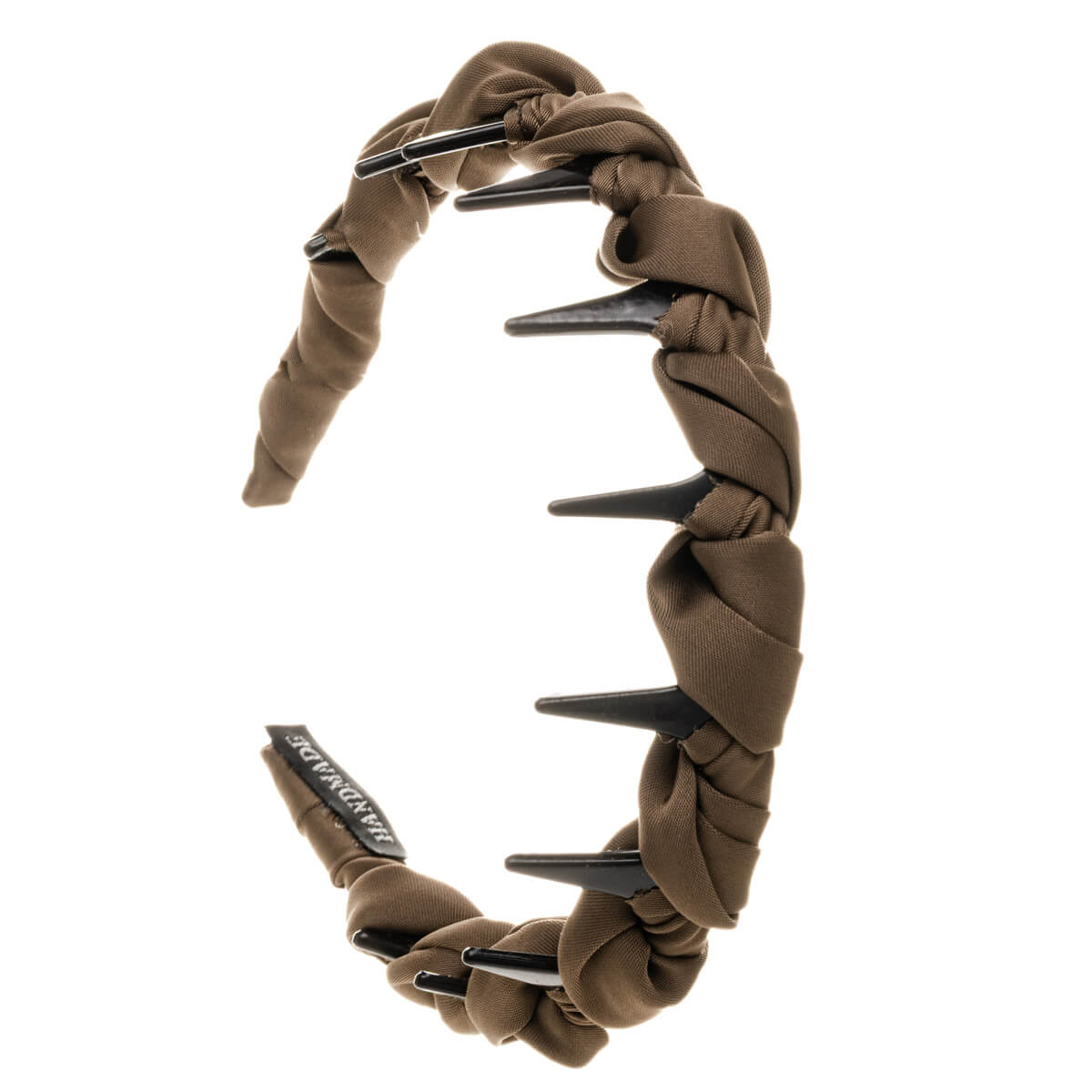 Satiinikangas koristaa kauniisti hiuspantaa. Tämä hiuspanta on muovinen tukeva hiuspanta arkiseen käyttöön. Hiuspannan piikit työntyvät tukevasti hiuksiin kun laitat pannan päähän.