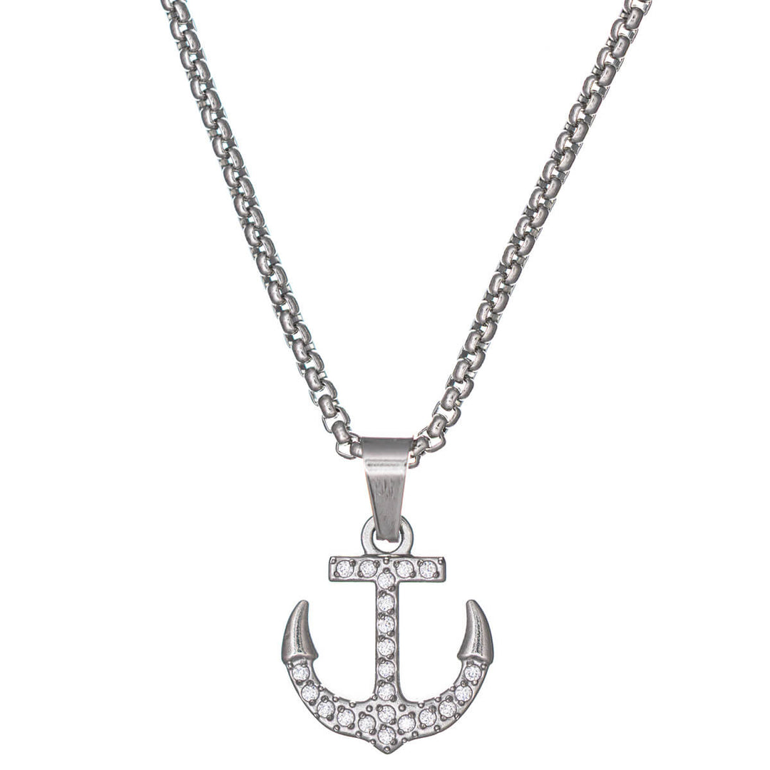 Kaunis siro ankkuri riipus on kauniisti koristeltu kirkkain lasikivin tässä kaulakorumallissa. Kaulakoru on valmistettu kokonaan kirurginteräksestä. Koru ei kulu käytössä.