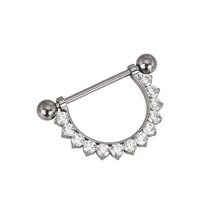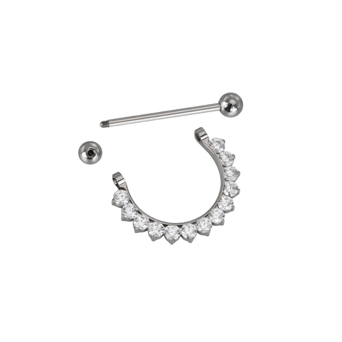 Kimalteleva nännikoru on koristeltu kirkkain zirkonia kivin. Korussa on barbell runko, minkä molemmat pallopäät irtoavat. Koristeena pujotetaan zirkonia kivin koristeltu puoliympyrä. U-muotoinen kaariosa on myös titaania.