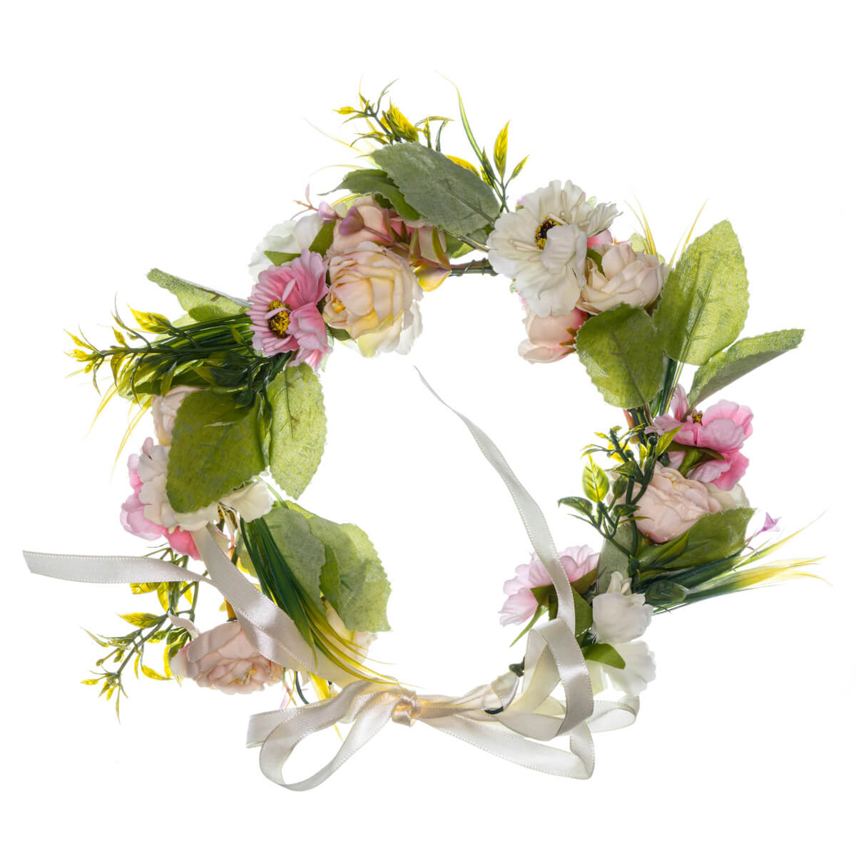 Seppele kootaan käsityönä aidon näköisistä tekokukista ja runsaasta vihreästä lehvästöstä. Taipuisa metallirunko muotoutuu mukavasti pään muotoon, ja leveä, läpikuultava satiininauha antaa runsaasti säätövaraa – kukkakruunu pysyy napakasti paikoillaan tanssista aamunkoittoon.