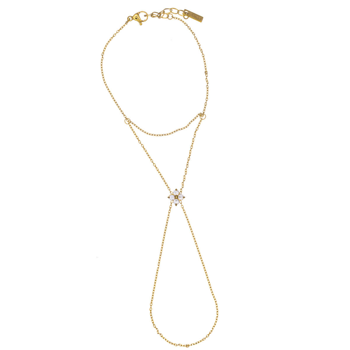 Elegantti käsikoru sormuksella yhdistää rannekorun ja sormuksen näyttäväksi mutta kevyeksi koruksi. Ranneketjusta kaksi ohutta ketjua yhdistyy keskellä olevaan kukkamaiseen koristeeseen, jota koristavat säihkyvät zirkoniakivet.