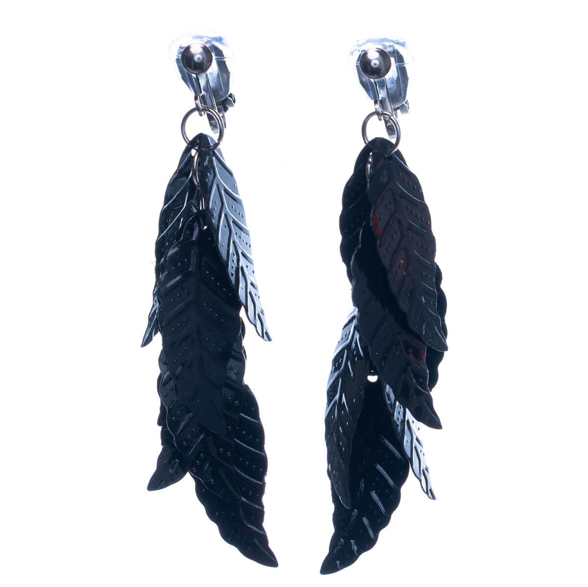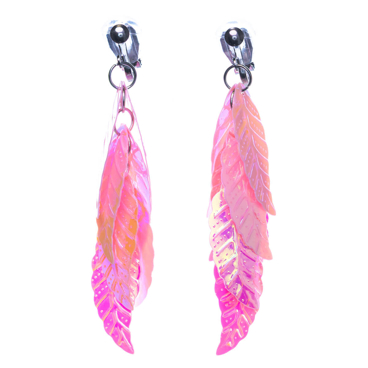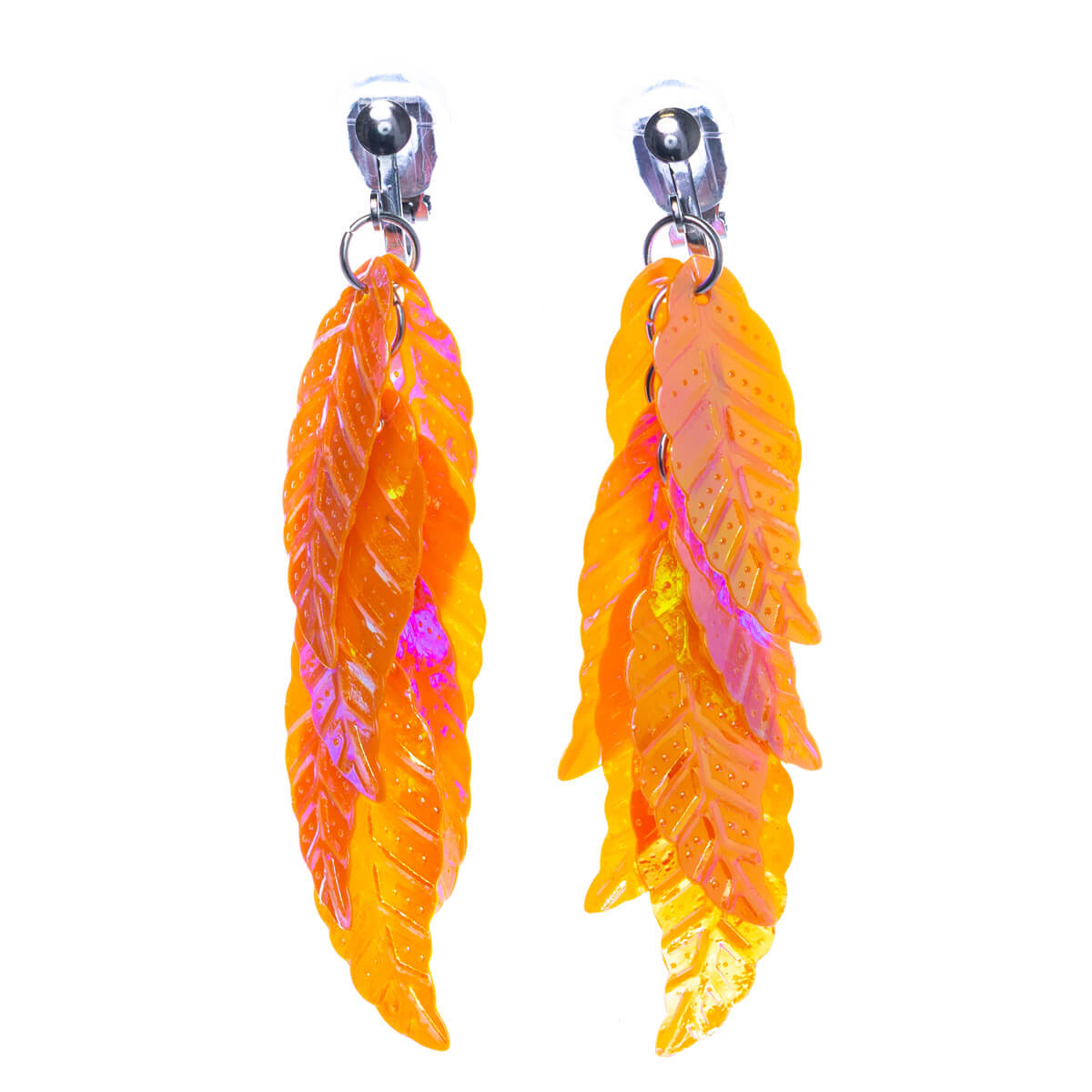 Wackelige Blätter aus Kunststoff zieren diese baumelnden Ohrringe. Die Stahlclips sind leicht und angenehm zu tragen.