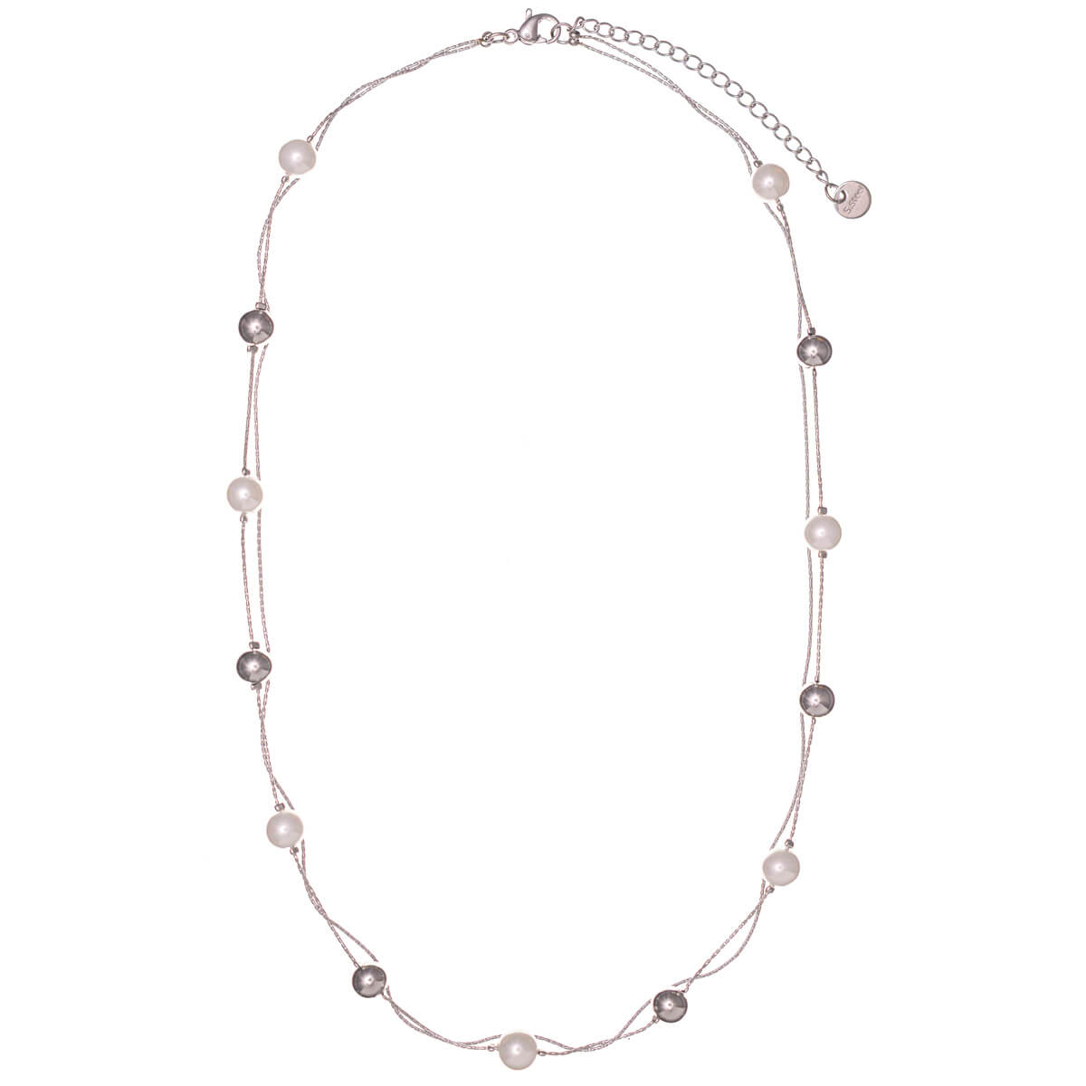 Die dünne Halskette ist mit weißen und stählernen Perlen verziert. Die Halskette ist vollständig aus chirurgischem Stahl gefertigt.