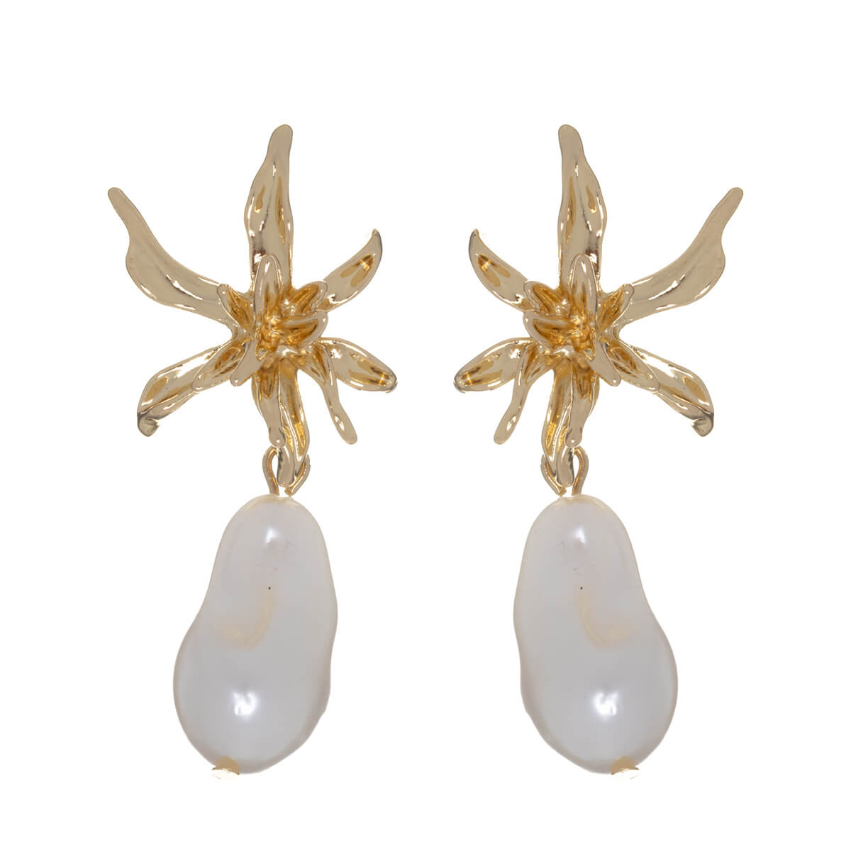 Ein auffälliger großer Blumenohrring, der mit einem asymmetrischen Perlenanhänger verziert ist. Dieser beeindruckende Perlenohrring ist auch perfekt für eine Party.