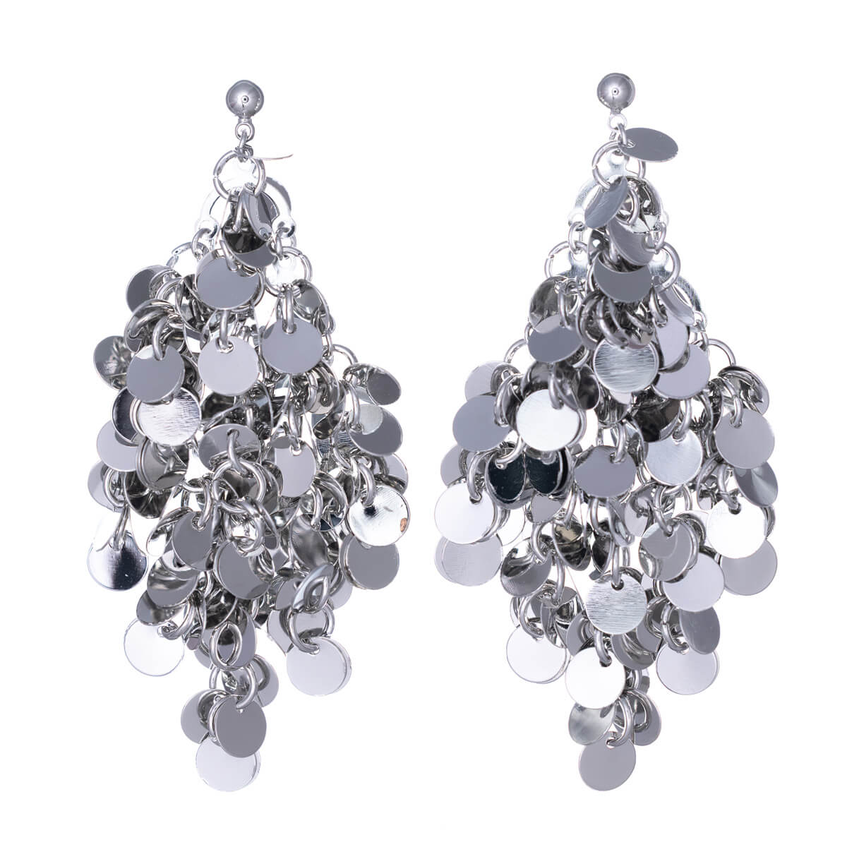 Metallische runde kleine Scheiben bilden einen schönen baumelnden Ohrring. Dieser Ohrring ist die perfekte Wahl für eine Party mit einem kleinen schwarzen Kleid. Der Ohrring ist eine elegante Wahl für Partys in der Weihnachtszeit.