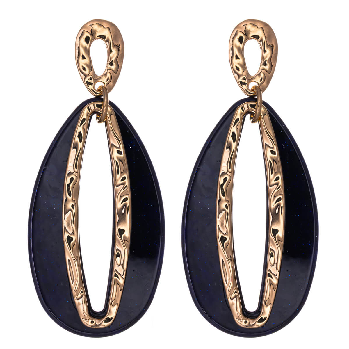 Glitzernder Kunststoff verleiht diesem hängenden Ohrringmodell einen festlichen Touch. Der ovale Anhänger ist in der Mitte offen und die Konturen der Öffnung sind mit einem kugelförmigen Metallprofil verstärkt. Das vergoldete Metall hat eine wellige Oberfläche.
