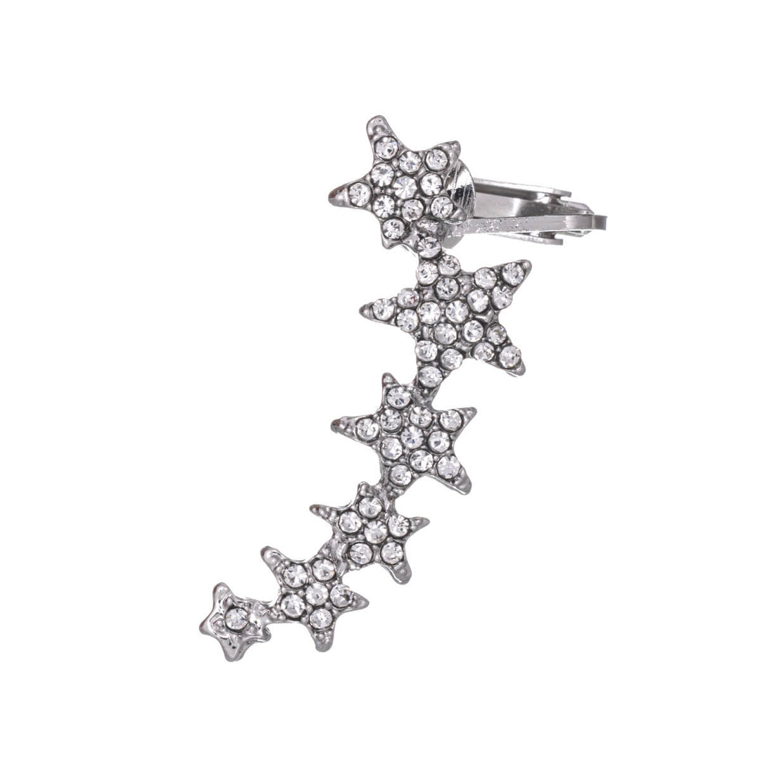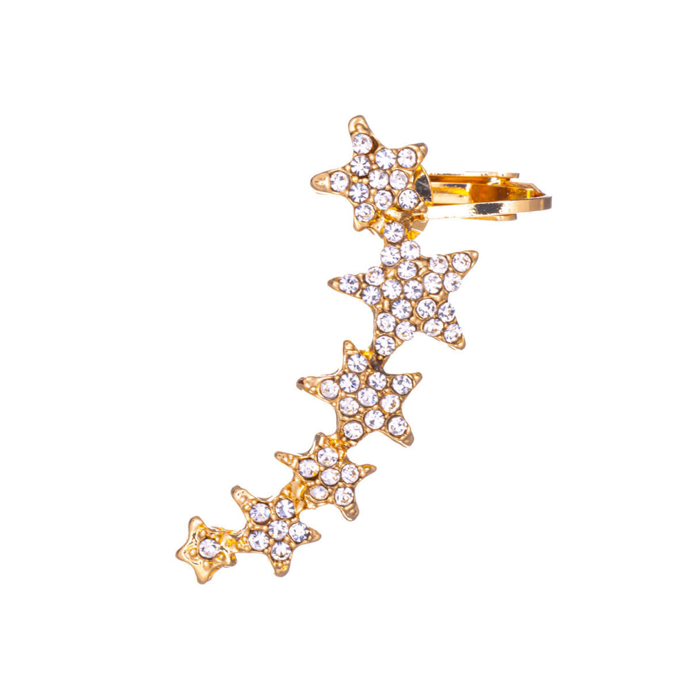 Die Ohrmanschette ist ein elegantes Schmuckstück aus Knorpel. Verziert mit klaren Glassteinen sitzt dieser geschwungene Statement-Ohrring elegant am Ohrläppchen. Der untere Teil des Schmucks wird wie ein Ohrring am Ohrläppchen befestigt und ragt entlang des Knorpels nach oben.