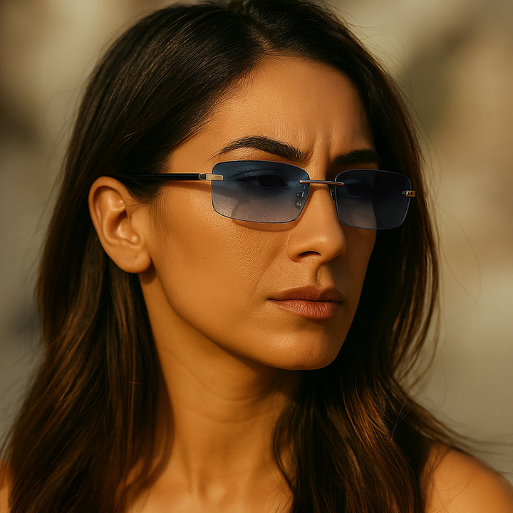 Die rahmenlosen rechteckigen Gläser sind stilvoll und leicht. In der Tat ist die Sonnenbrille Modell fast unmerklich auf dem Gesicht. Nasenpads ermöglichen es Ihnen, die Sonnenbrille so einzustellen, dass sie gut auf dem Gesicht sitzt.