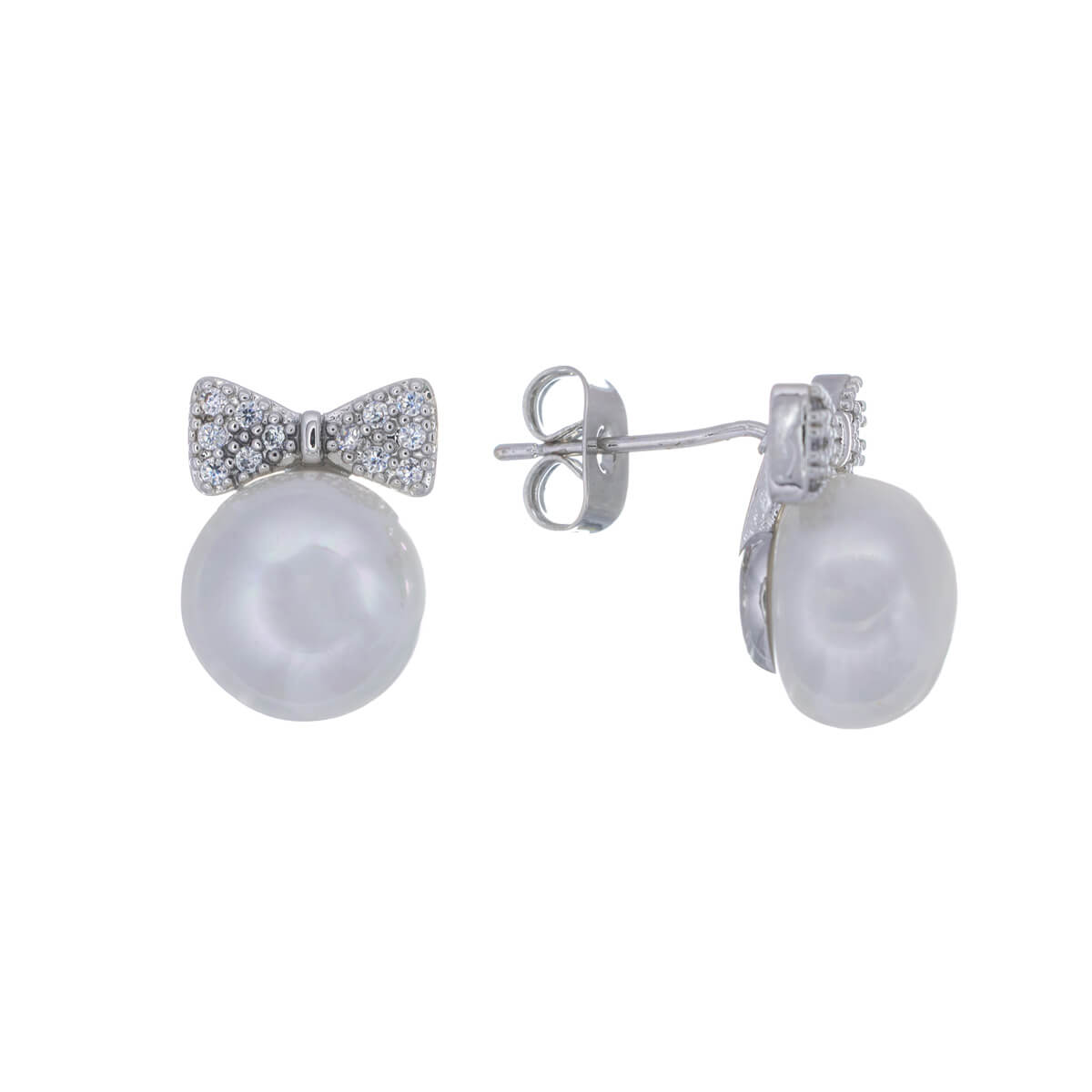 Helle Zirkoniasteine funkeln wunderschön in diesen Perlenohrringen. Die Schleife über der Perle ist mit kleinen Zirkoniasteinen verziert. Das Produkt wurde sorgfältig verarbeitet und mit hoher Qualität beschichtet.