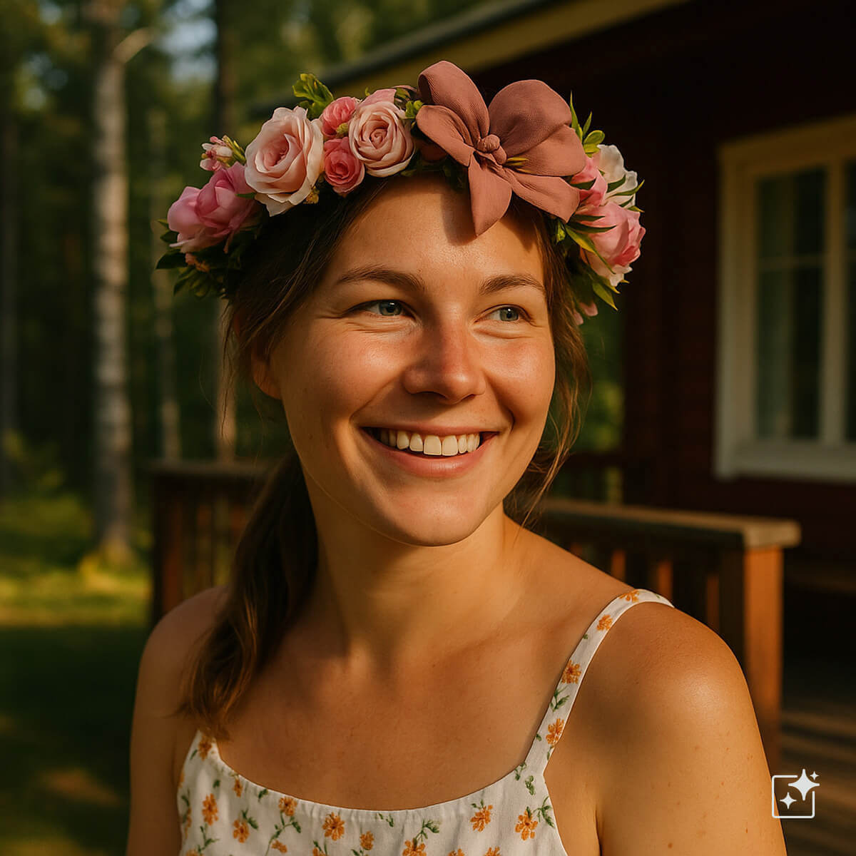 A large magnolia and soft powder-coloured rose buds create a crown that exudes calm elegance - the perfect choice for a bride, a confession or graduation party, or for the midnight night of Midsummer. The light palette enhances the natural beauty of the hairstyle and delicately reflects light onto the face.