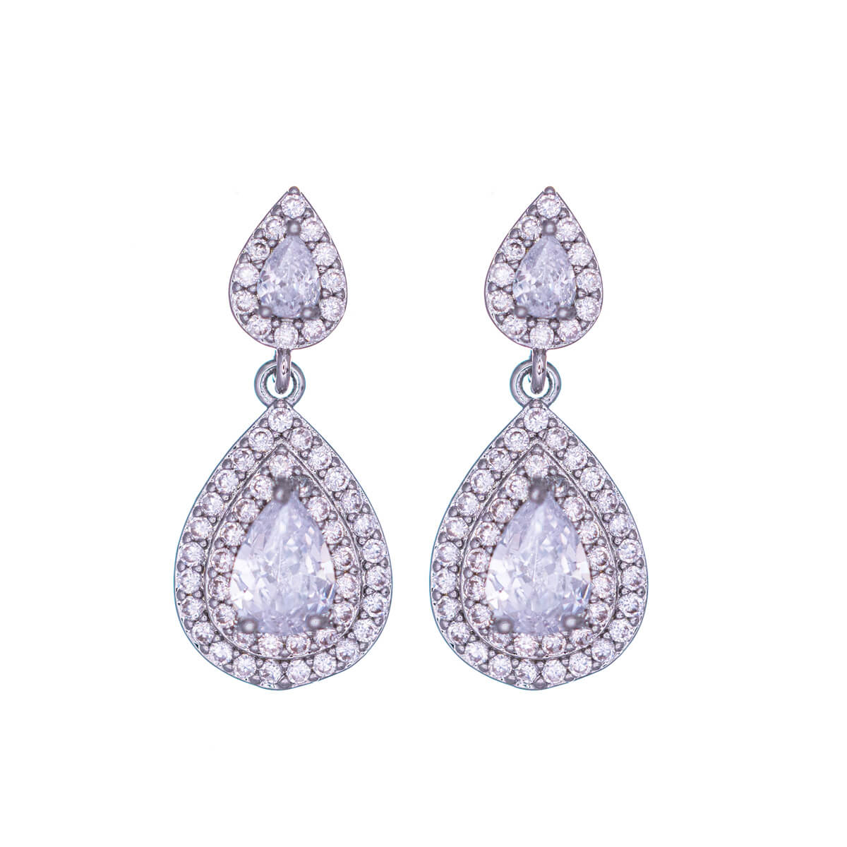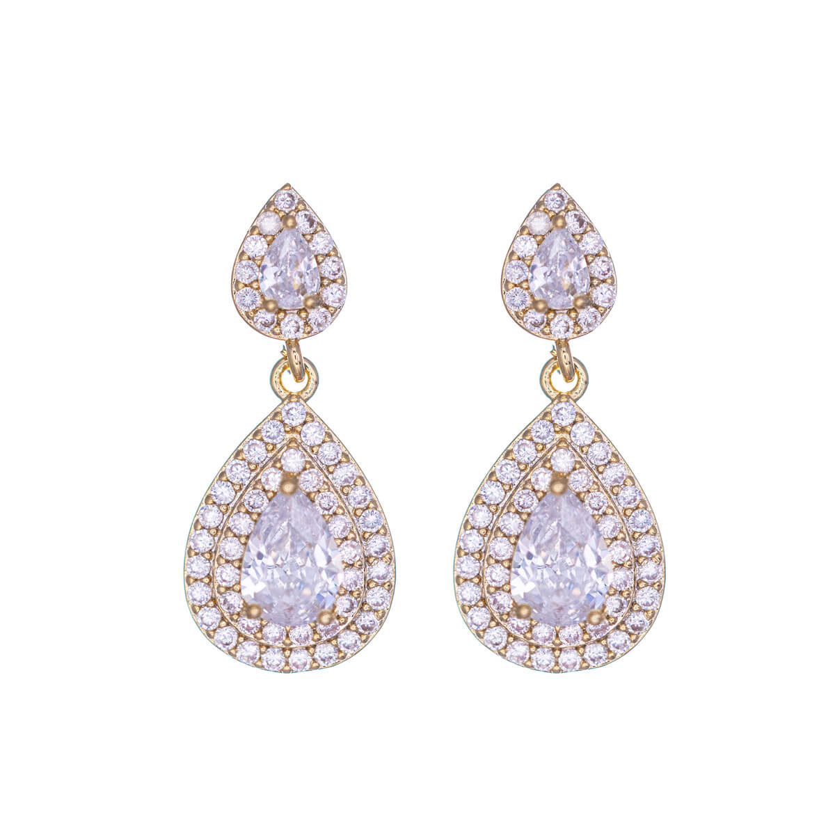 - Teardrop-shaped zirconia stones at the top and bottom