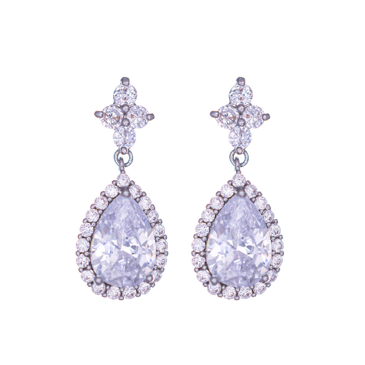 Elegant and eye-catching dangling party earrings combining a classic teardrop shape with a decorative upper section. The upper section of the earring consists of four round zirconia stones, creating a floral and elegant look.