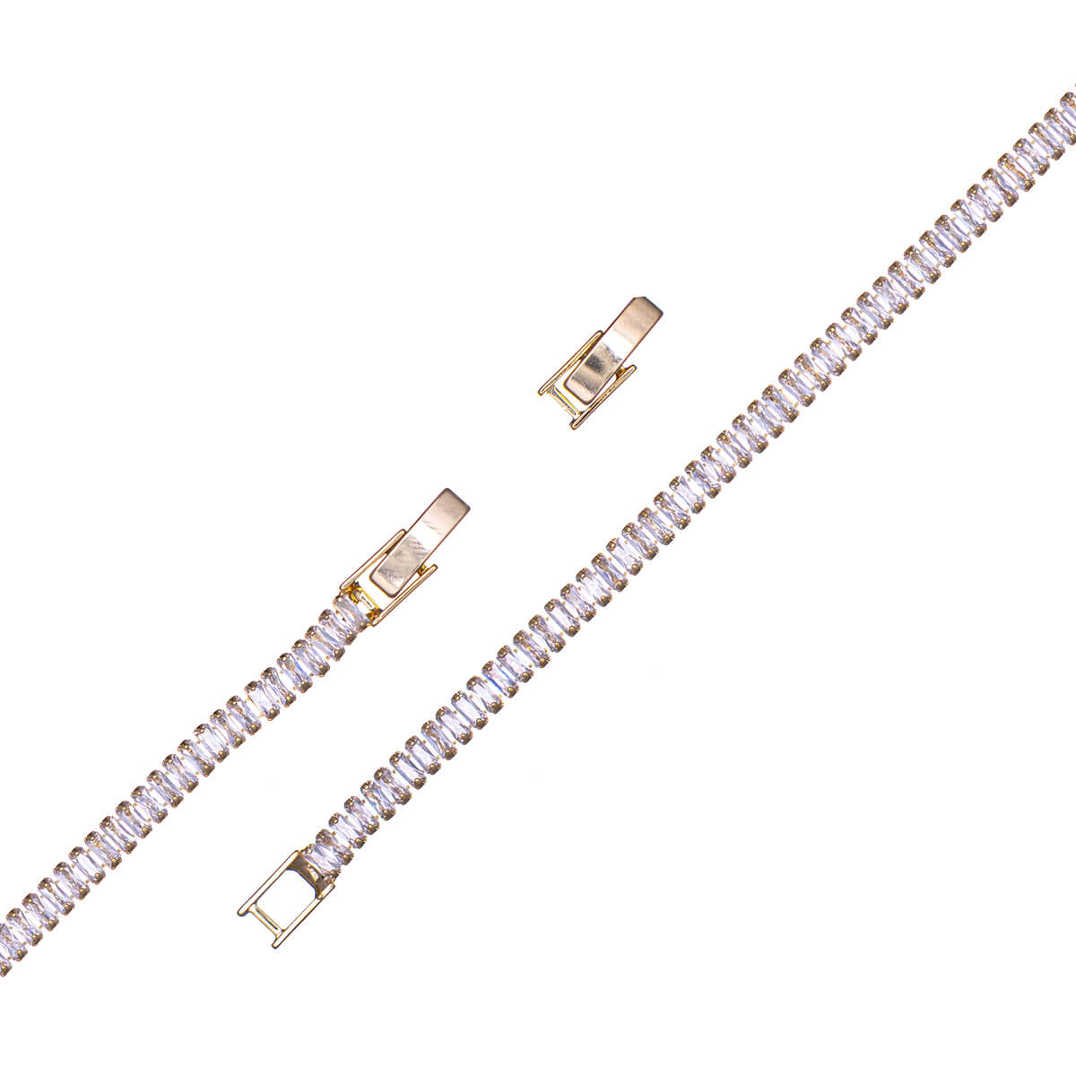 A timeless and elegant tennis bracelet with rectangular baguette-cut zirconia stones forming a uniform and subtle festive row. This delicate yet striking design is perfect for parties, evening events, and adding the finishing touch to a stylish everyday look.