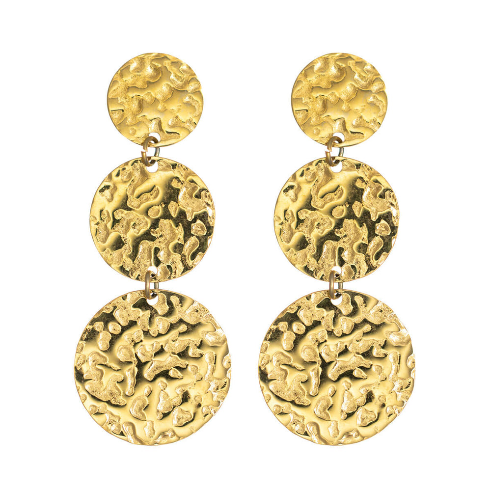 All-steel earrings are made to withstand wear and tear. In this design, three flat circular rings form a dangling earring. The metal surface is uneven, showing that the surface has been forged.