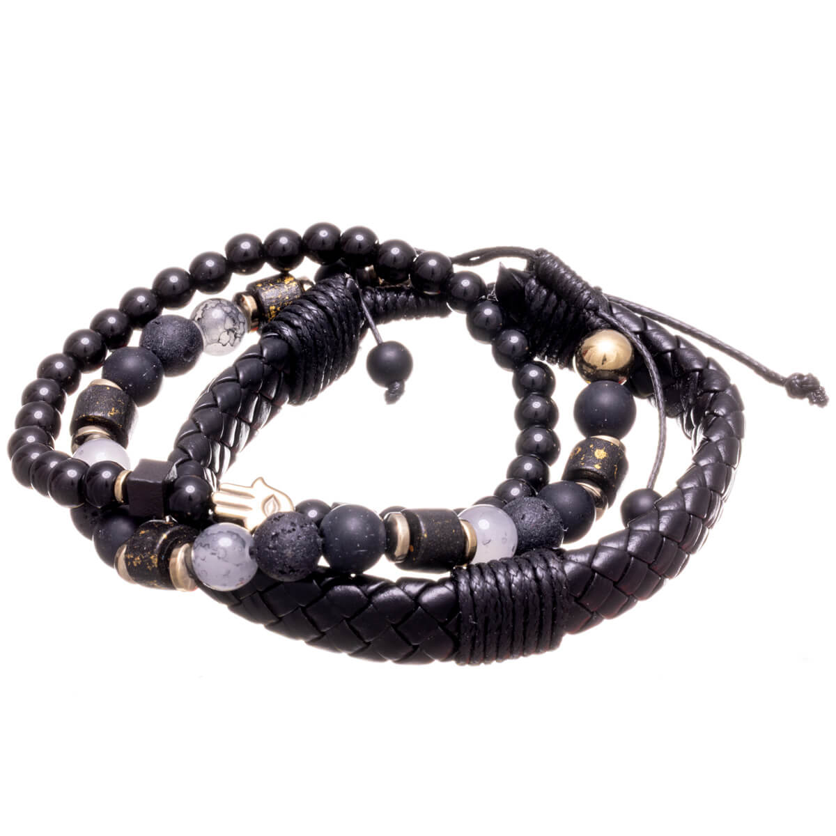 The set includes three different bracelets: an adjustable beaded bracelet with decorative details, an elastic black beaded bracelet with a symbolic decoration, and a wider faux leather braided bracelet. The bracelets can be worn together or separately, depending on your style and the occasion.