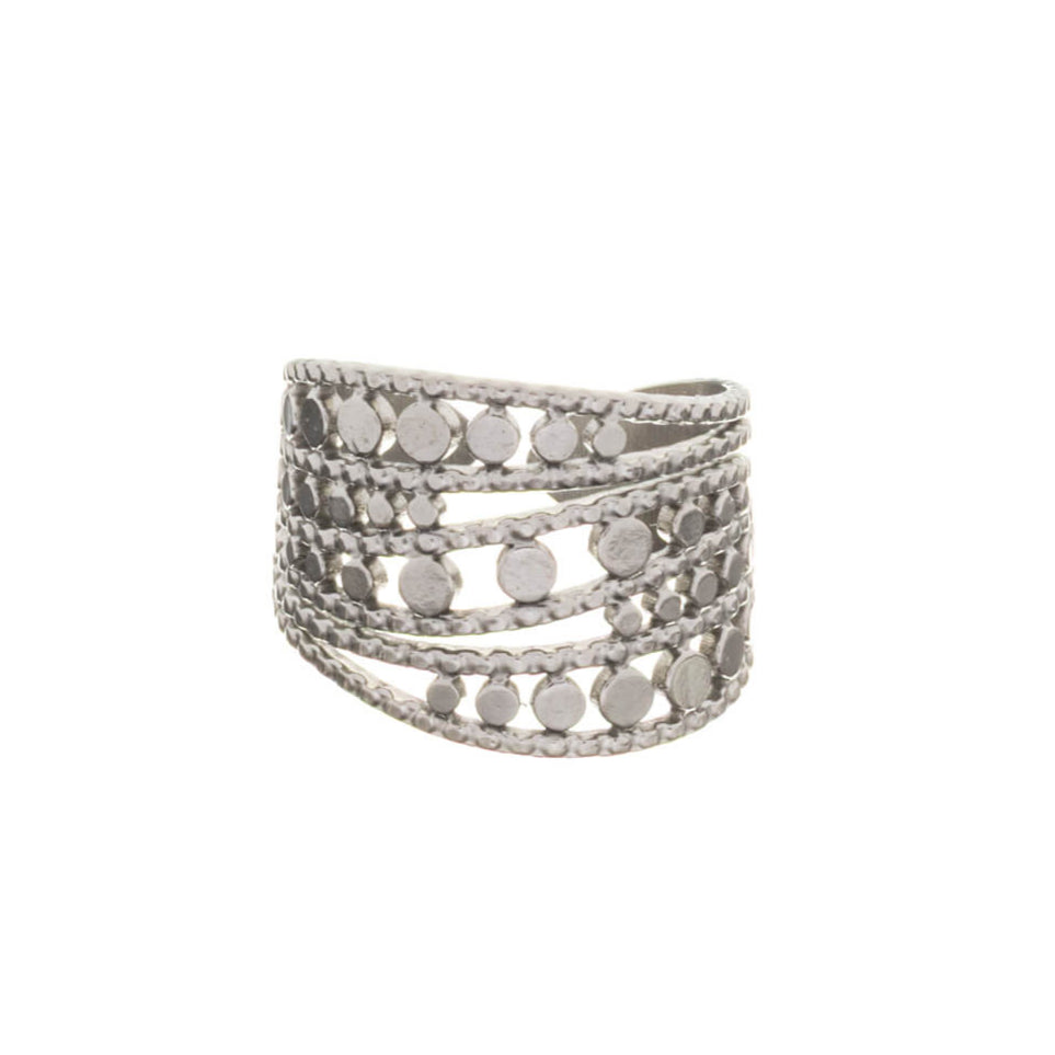 Beautiful round shapes of different sizes adorn this wide ring. The one-size ring is easy to wear as the size of the ring can be adjusted according to your finger. The ring is made entirely of steel.