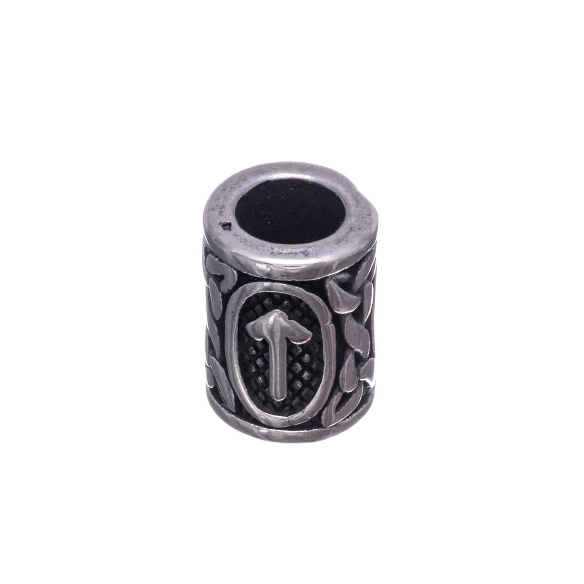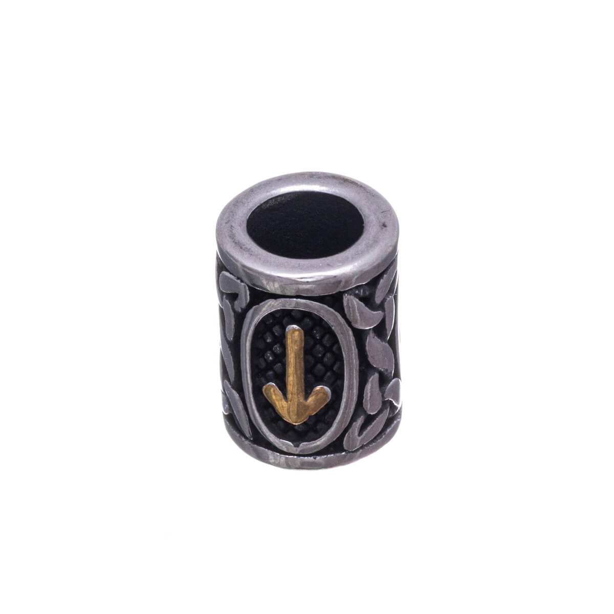 At the center of this beard ornament is an arrow-like rune symbol, which refers to initiative, decision-making, and the courage to act. The shape symbolizes the moment when a direction has been chosen and there is no more hesitation. The oval frame surrounding the arrow gathers power together and gives it boundaries: the energy is controlled and purposeful. The braided Viking ornamentation ties the symbol to tradition and the wisdom of ancestors, reminding us that true courage is based on experience. The gold-colored detail emphasizes the significance of the action and refers to achievement and goal.