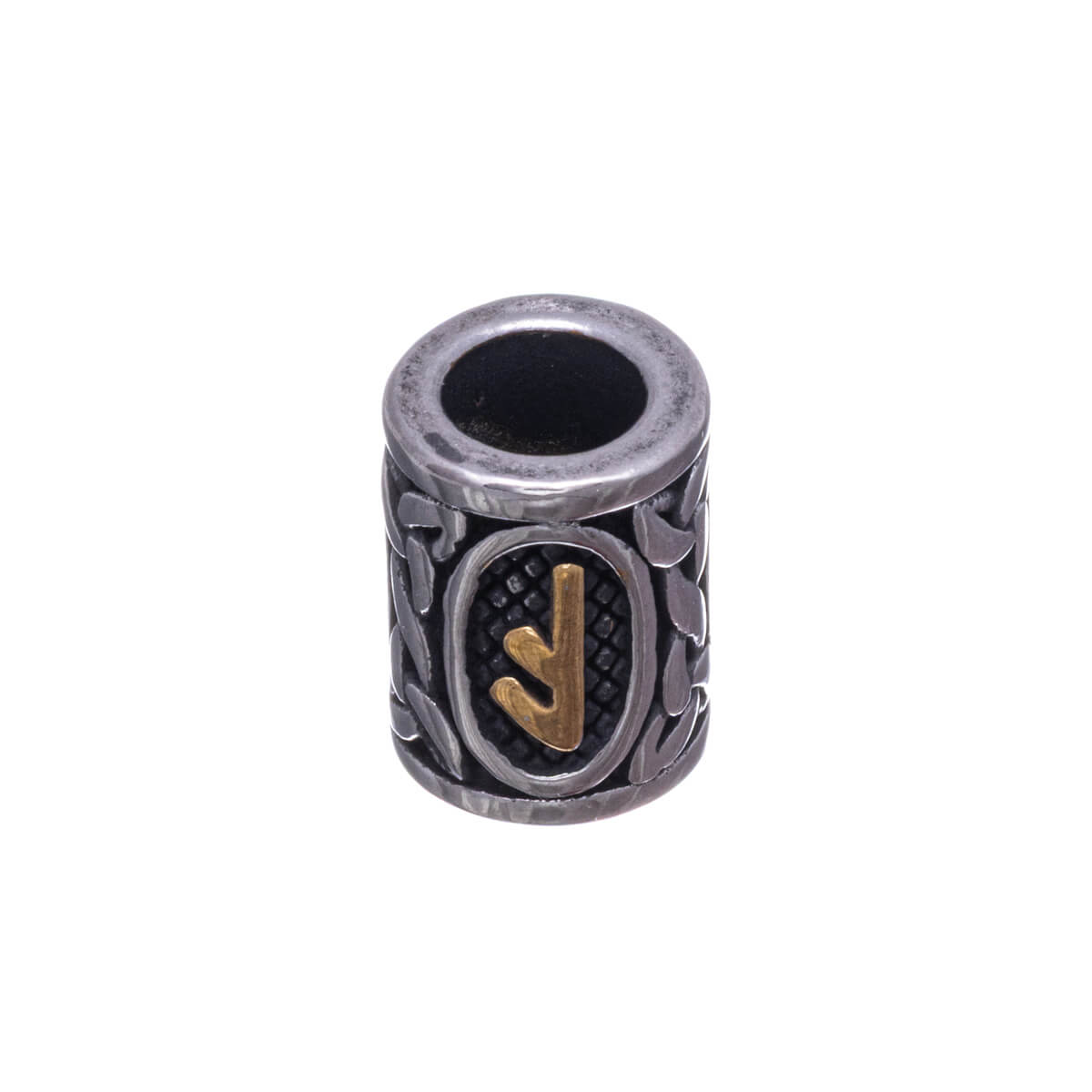 The pattern on the beard ornament is based on Viking rune symbolism and decorative braided knots. The rune-like symbol in the center of the ornament represents an ancient symbol of power that was used for protection, determination, and control over one's own destiny. The braided patterns framing the rune refer to the Nordic concept of the intertwining of life and struggle – nothing is separate, but everything is connected. The gold-toned detail emphasizes dignity and warrior honor, reminding us that true power comes from experience and deeds.