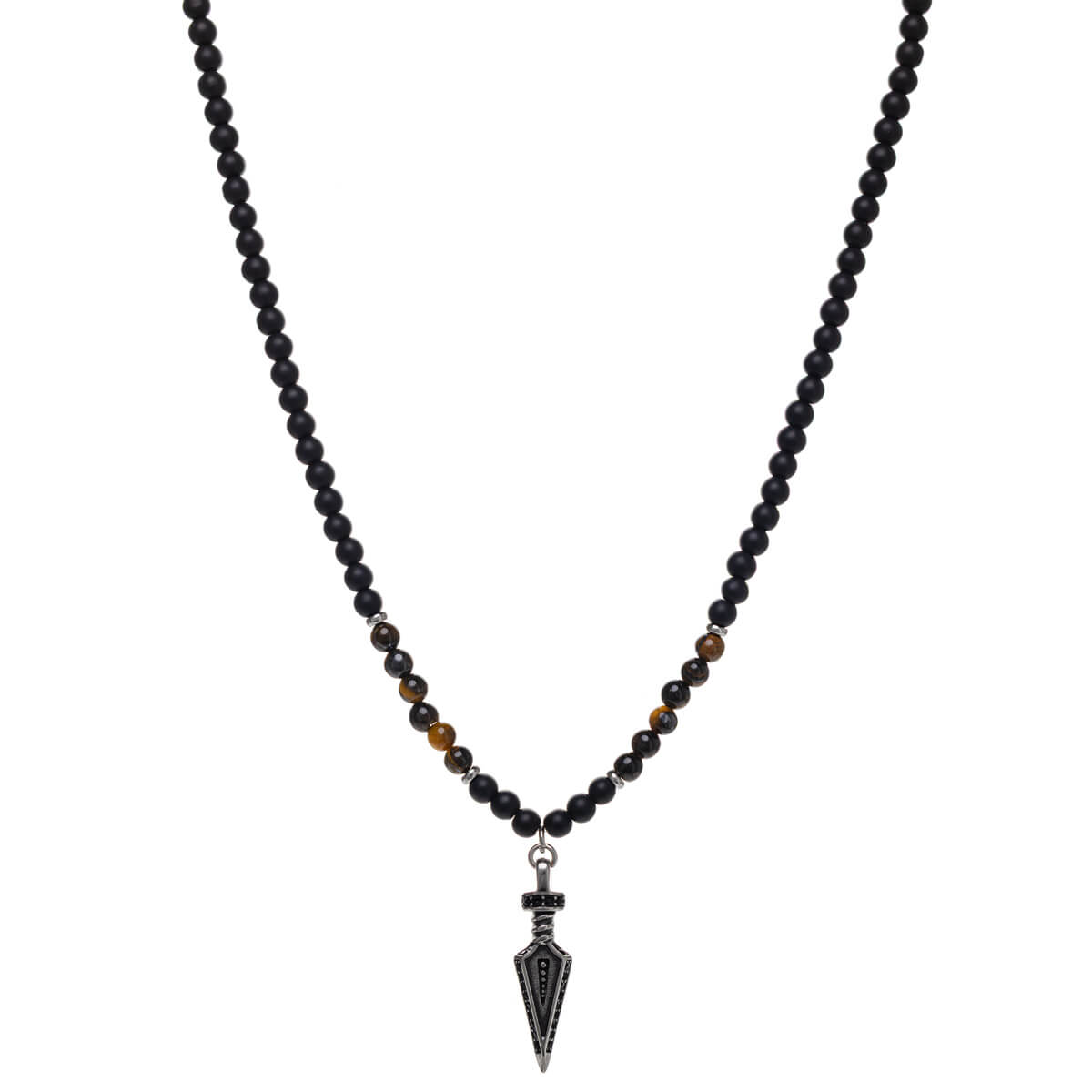 A long and striking necklace combining matte black glass beads, brown natural stone beads, and a detailed arrow pendant. The black glass stones decorating the pendant add subtle contrast and depth to the necklace.