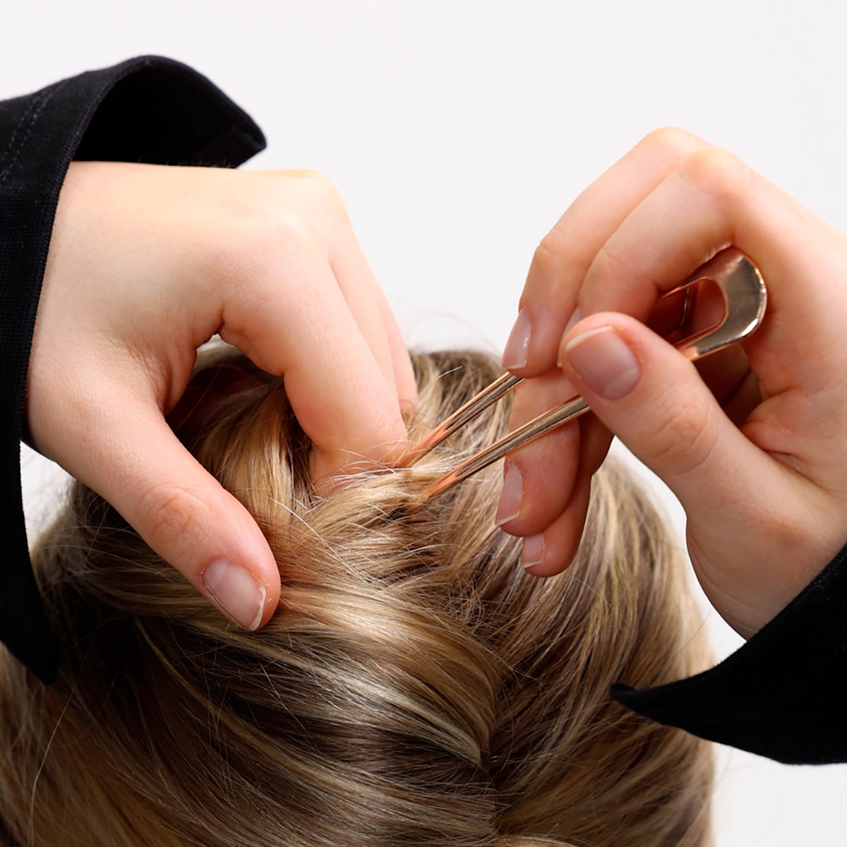 Create elegant hairstyles in an instant with this set of three metal French hairpins. Each hairpin is made of durable metal that holds your hair securely in place and adds French elegance to your hairstyle. The set includes three hairpins of different sizes, allowing you to style a classic bun, a casual updo, or a neat everyday hairstyle.