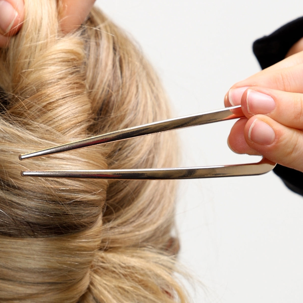 Shiny metal hairpin (10 cm x 2 cm) – a smooth-surfaced and eye-catching option that adds a luxurious finish to your hairstyle.
