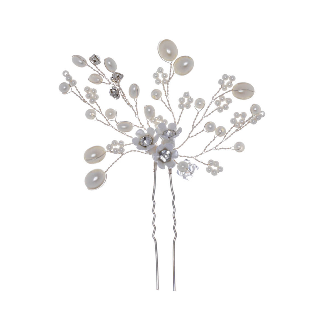 Säkenöivä hiuskoriste tuo kampaukseen varmasti viimeistelyn tuntua. Tässä mallissa hiuskorun keskellä on kolme kukkaa kirkkailla lasikivillä. Muotoiltavat rautalangat ovat koristeltu erinkokoisin helmin ja kirkkailla lasikivillä.