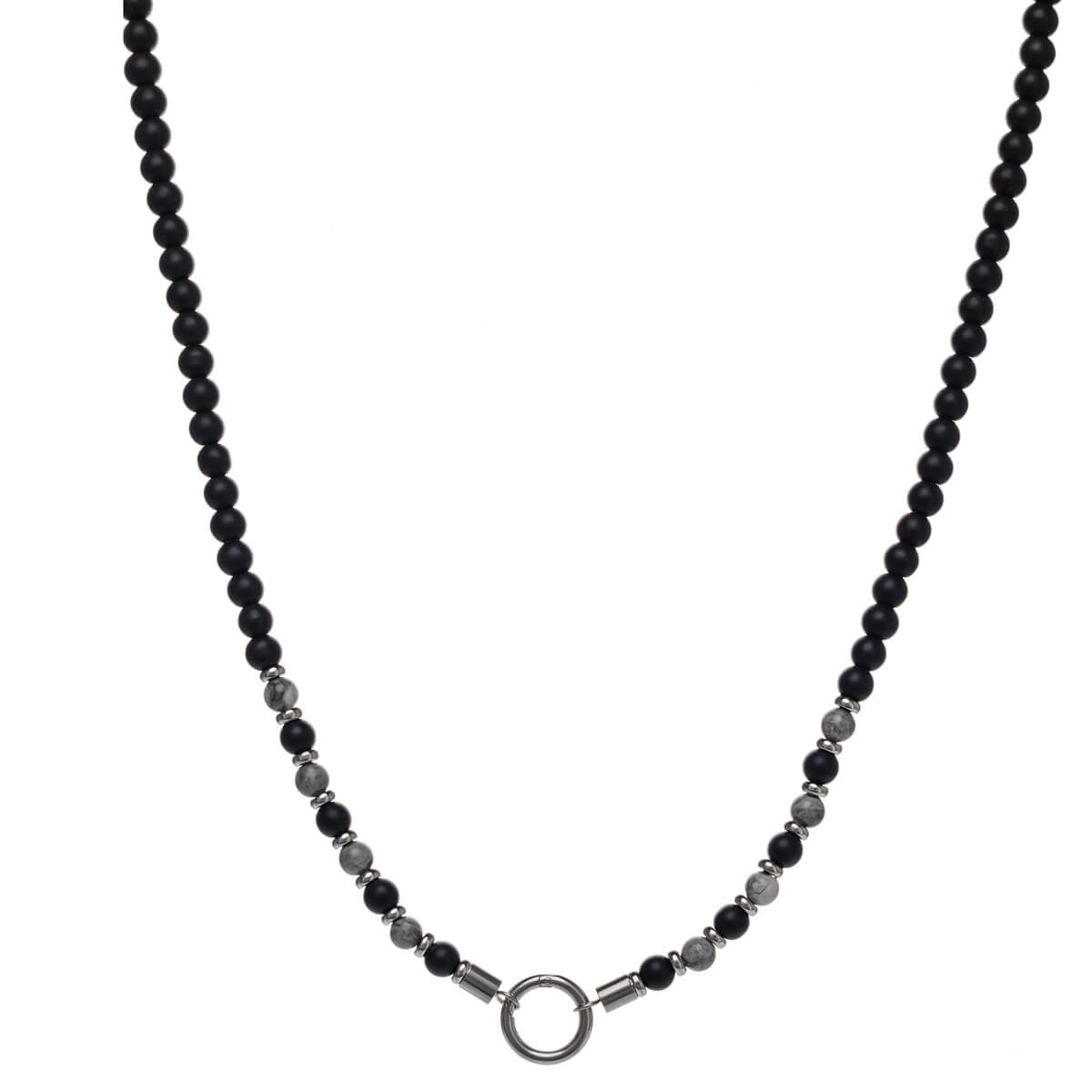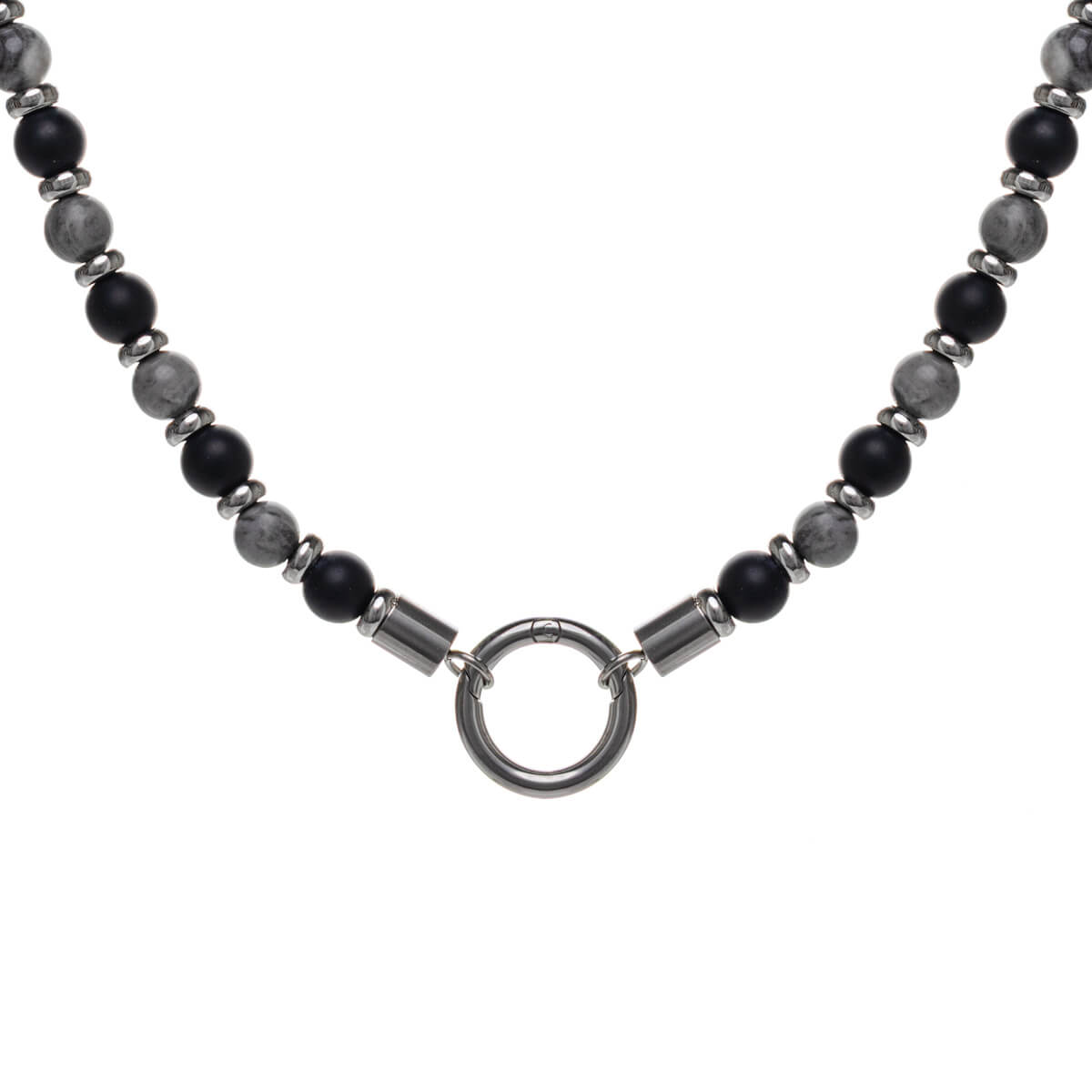 Moderni ja monikäyttöinen helmikaulakoru, jossa yhdistyvät mattamustat lasihelmet ja harmaat luonnonkivihelmet. Korun ilme on rauhallinen ja minimalistinen, mutta teräksinen clicker-rengas tuo siihen selkeän yksityiskohdan.
