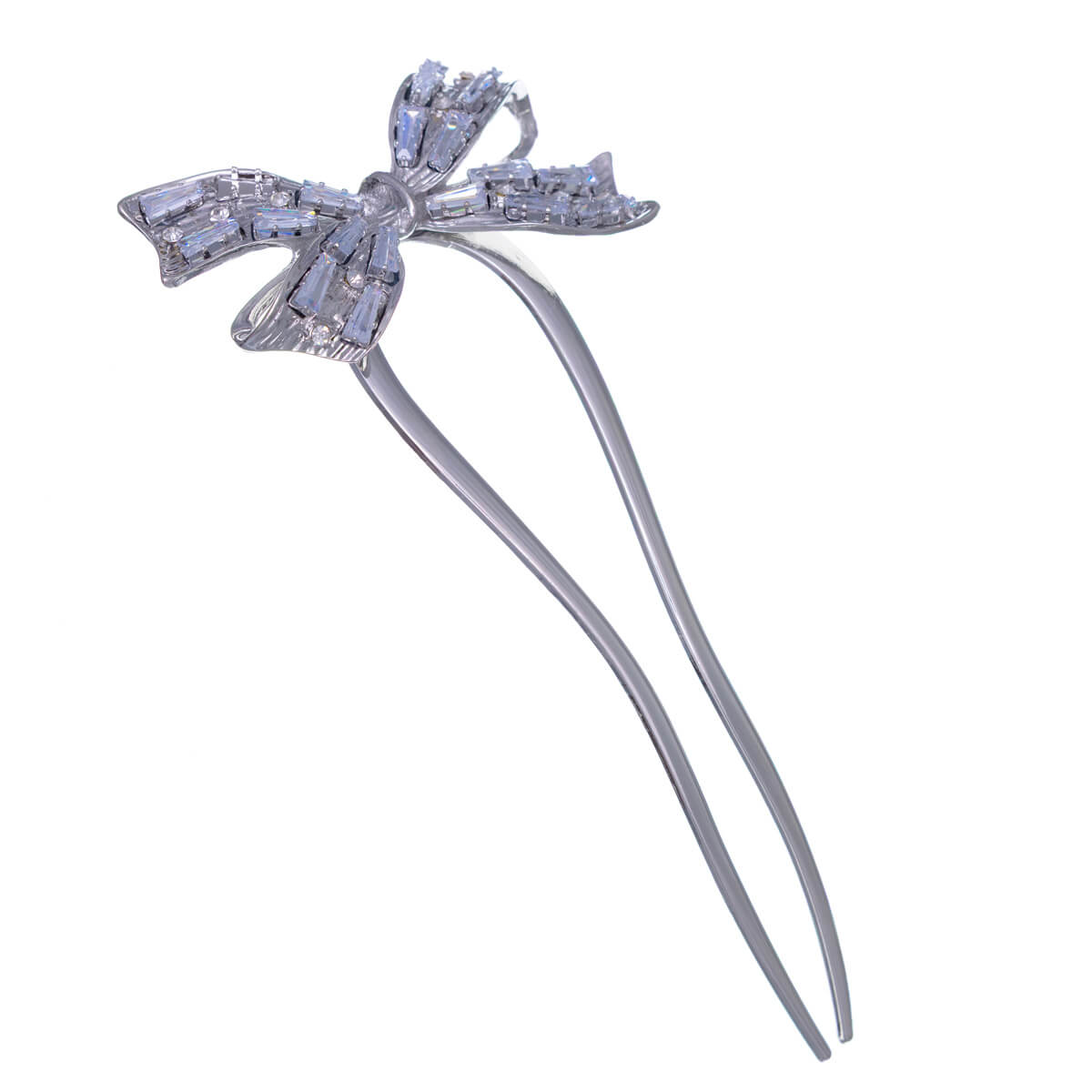 Isolla rusetilla ja kirkkailla kivillä koristeltu nutturaneula (eng. french hair pin / hair fork) kiiltävällä metallipinnalla tuo ylellisyyttä ja tyylikkyyttä kampaukseesi. Kestävä ja laadukas nutturaneula on täydellinen valinta nopeaan ja eleganttiin hiusten muotoiluun. Ranksalainen hiuspinni on klassinen valinta.