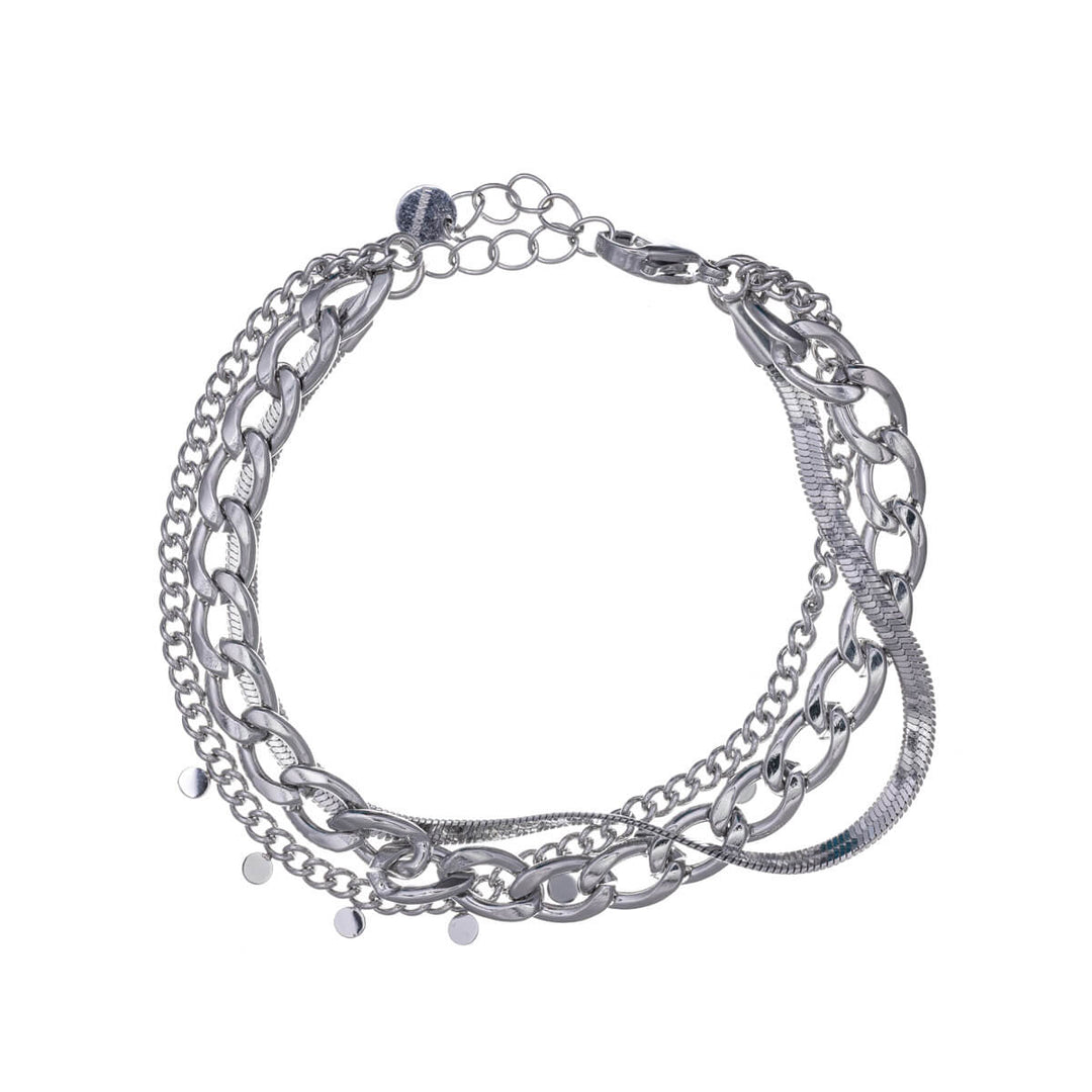 Kaunis kiillotettu teräs on täydellinen valinta rannekoruun. Tässä mallissa kolme erilaista ketjupunosta muodostavat yhden rannekorun: litteä käärmeketju, litteä panssariketju ja seitsemällä litteällä pallolla koristeltu panssariketju. Teräksinen rannekoru ei kulu.