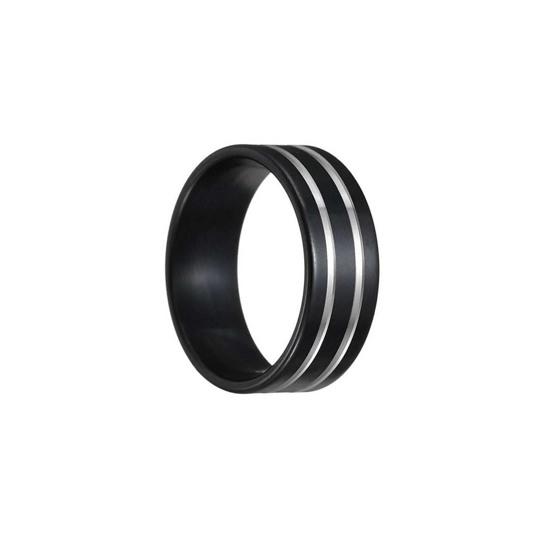 Musta terässormus teräksen värisillä raidoilla on maskuliininen. Teräksen väriset raidat ovat urat sormuksen pinnassa.