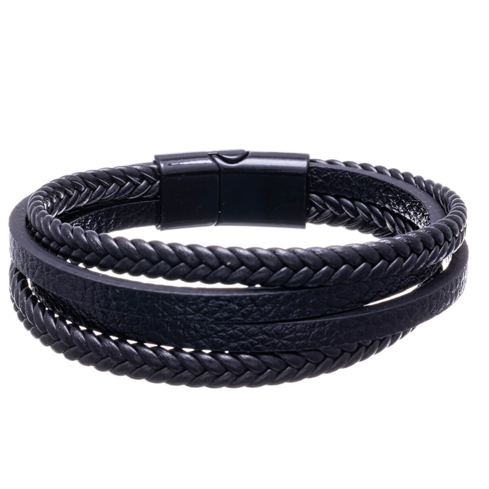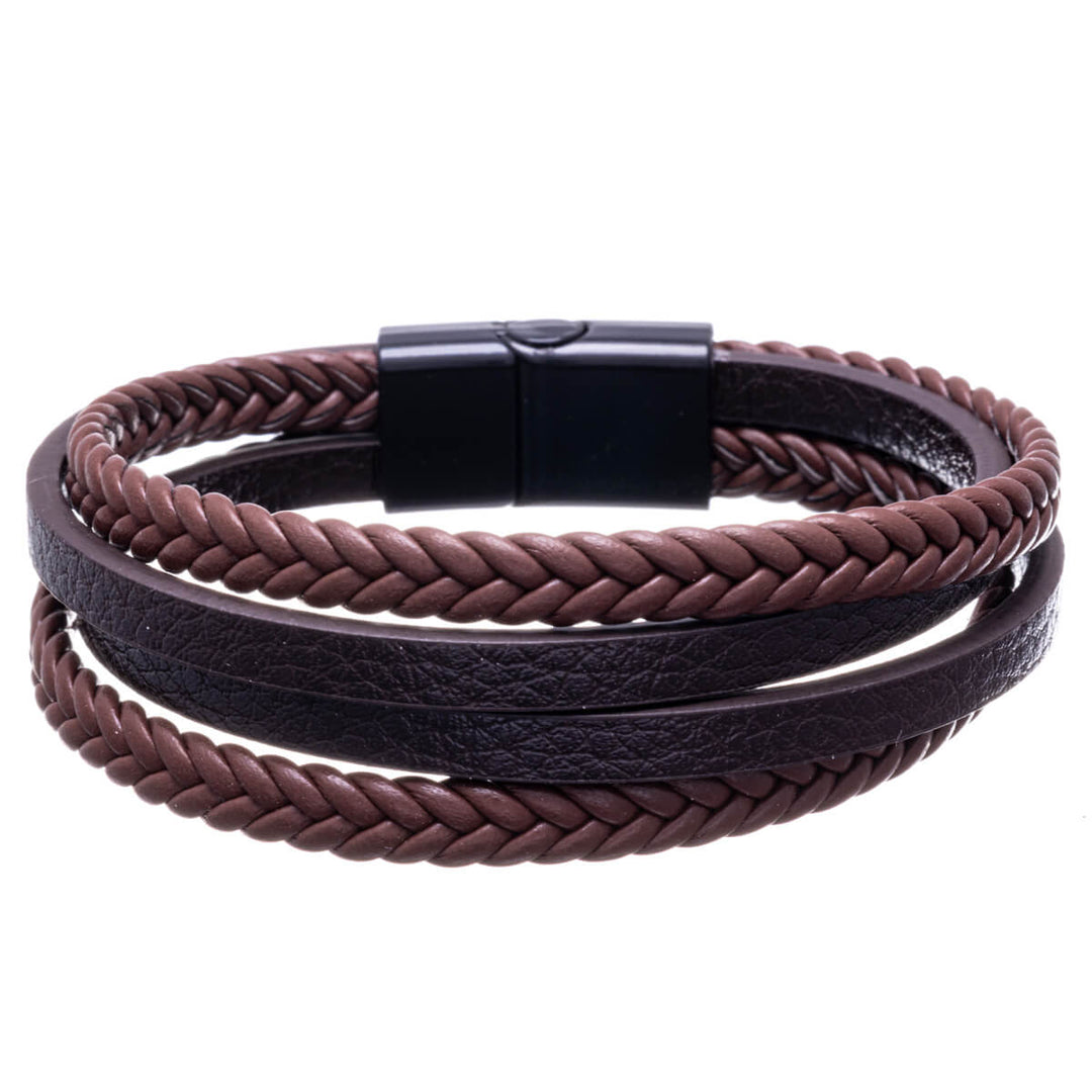 Neljärivinen rannekoru antaa mukavasti leveyttä korulle. Kaksi nahkaremmeistä on punottuja ja kaksi aivan tasaisia. Tukeva lukko on vahvistettu magneetilla.