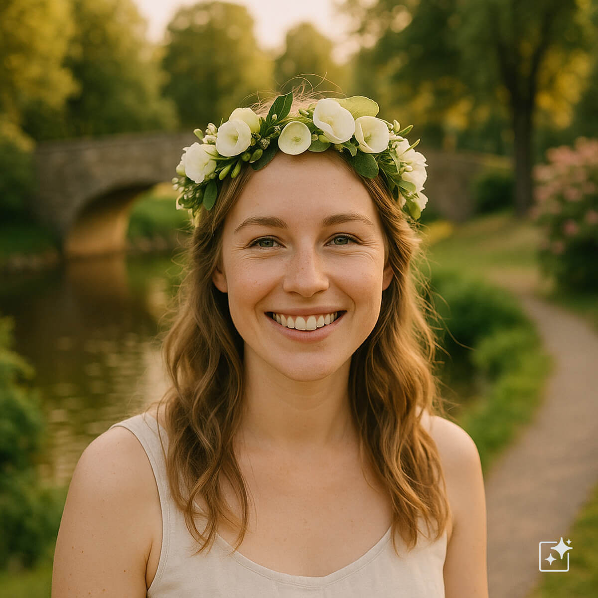 Kukin kukka on aseteltu käsin aidon tuntuisista elementeistä, joten saat luonnollisen, pitkäikäisen hehkun ilman kuihtuvia terälehtiä. Taipuisa metallirunko mukautuu huomaamattomasti pään muotoon, ja leveä satiininauha tekee koon säätämisestä helppoa – kruunu pysyy napakasti paikoillaan, vaikka tanssit tuntikausia.