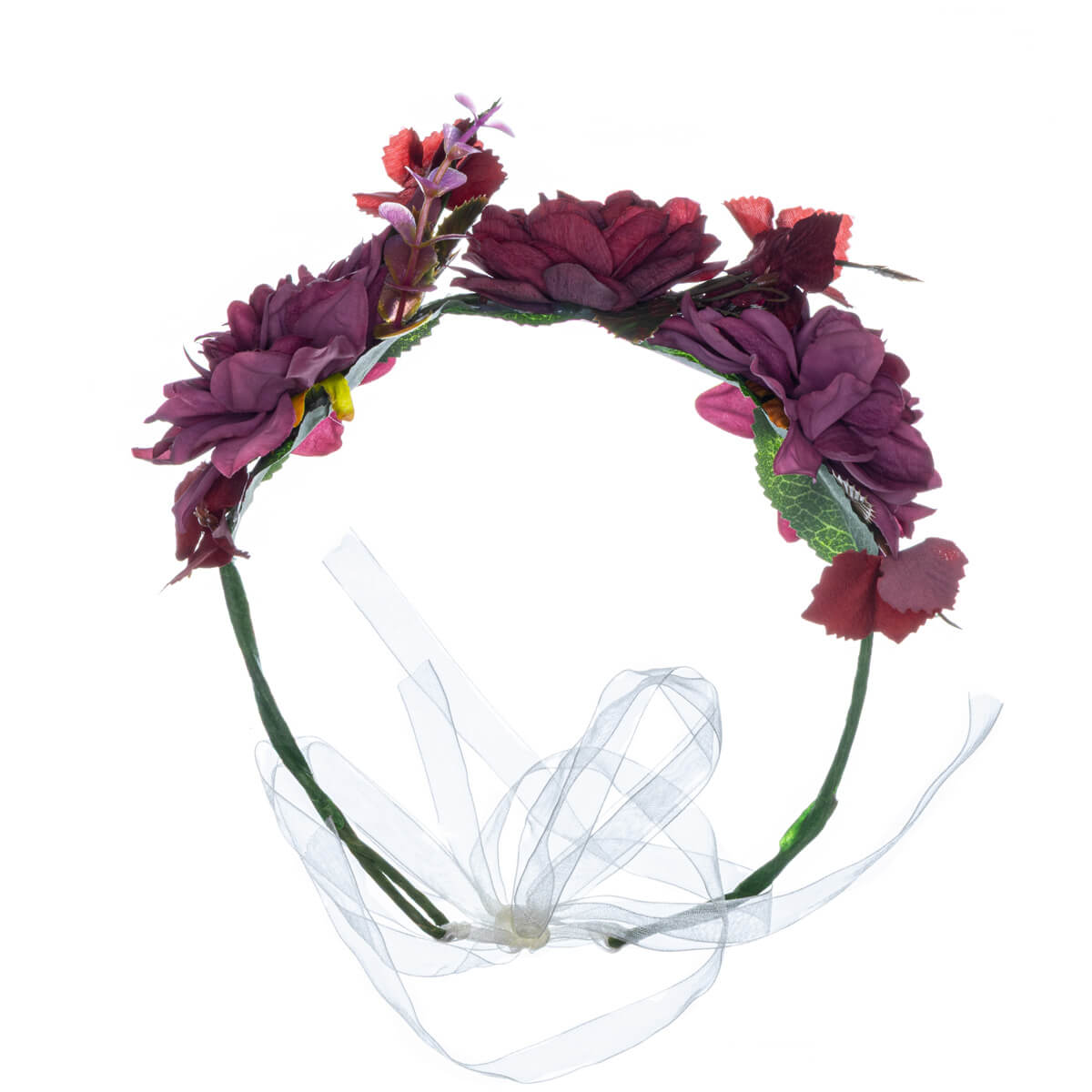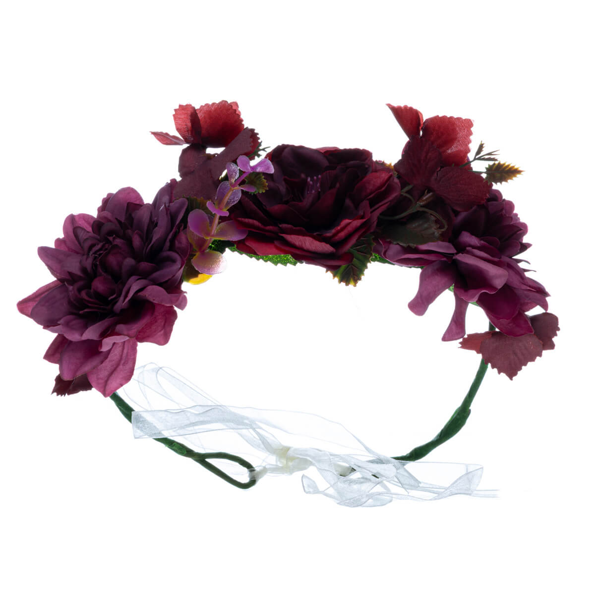Varje blomma är handarrangerad av realistiskt utseende krysantemum, och det mörka bladverket accentuerar blommornas fantastiska lager. Den flexibla metallramen sitter bekvämt på huvuden i alla storlekar, och det genomskinliga satinbandet ger gott om justeringsmöjligheter - så kronan sitter på plats från danssteg till gryning.