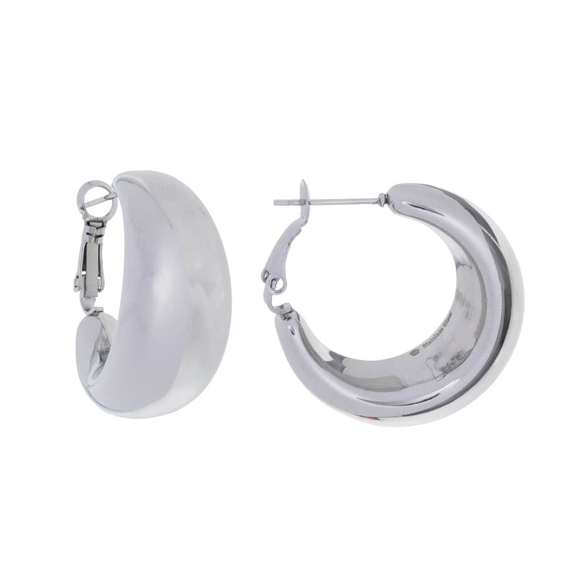 Breda örhängen i stål är snygga och hållbara. Den gångjärnsförsedda klaffen är lätt att öppna och snäppa tillbaka på örhängenas spets. Produkten är helt tillverkad av stål.