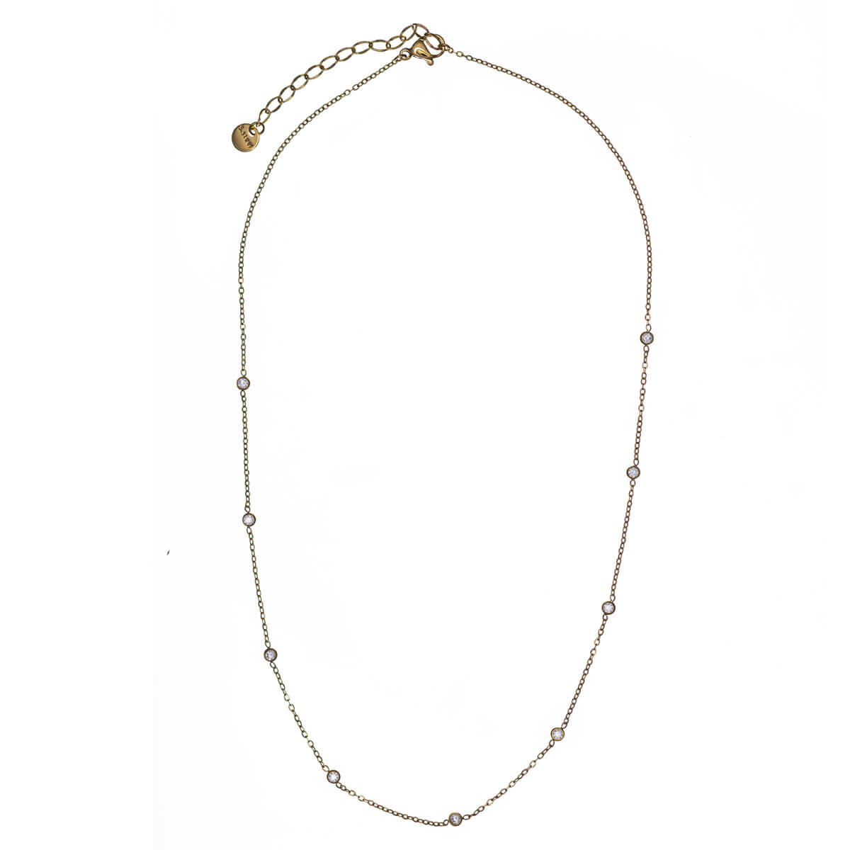 Det tunna halsbandet är dekorerat med små zirkoniastenar i denna design. 9 zirkoniastenar pryder halsbandet. Smycket är helt tillverkat av kirurgiskt stål.