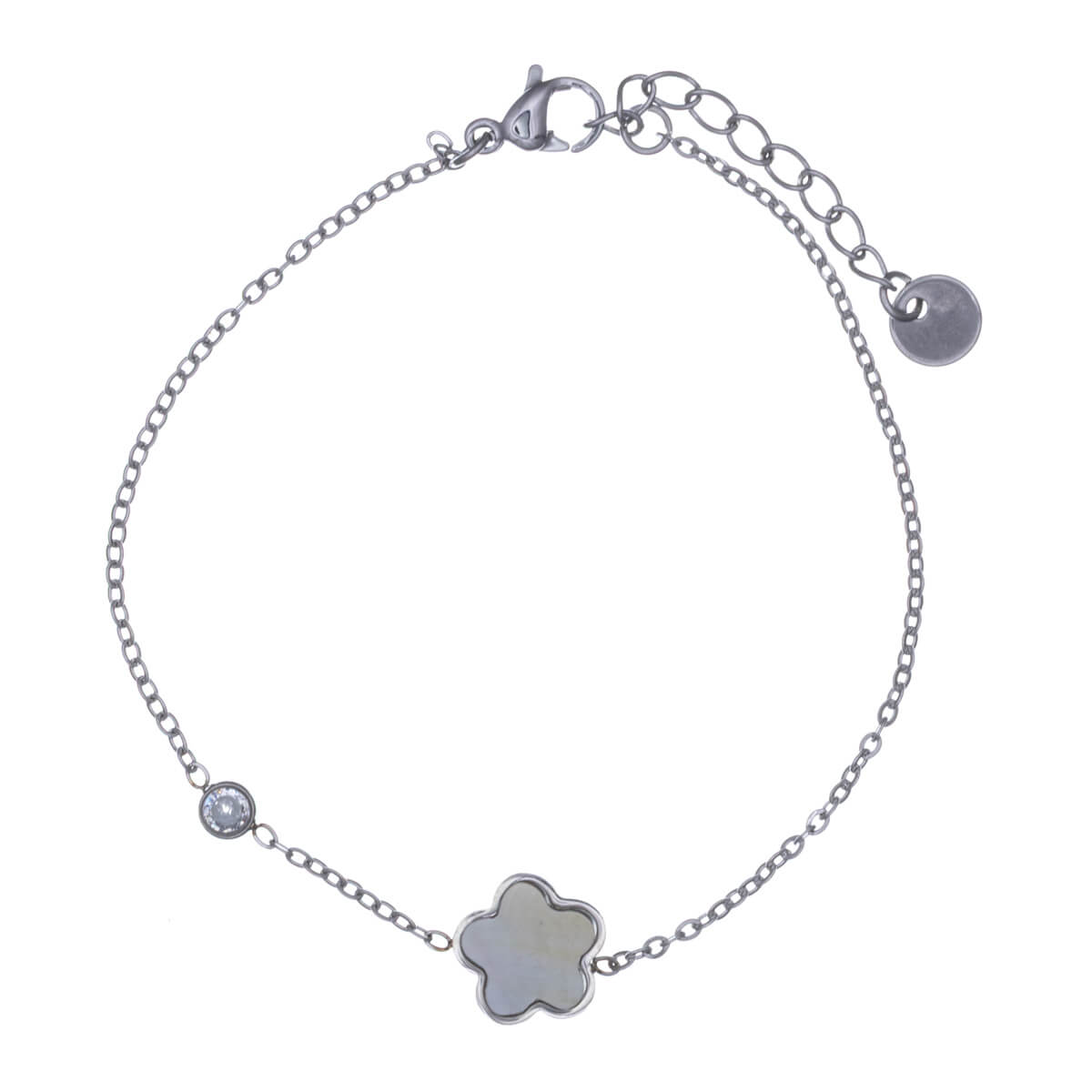 Det tunna armbandet är dekorerat med ett blommigt mönster och en liten zirkonsten. Blomman är dekorerad med en pärlmix. Armbandet är helt tillverkat av kirurgiskt stål.