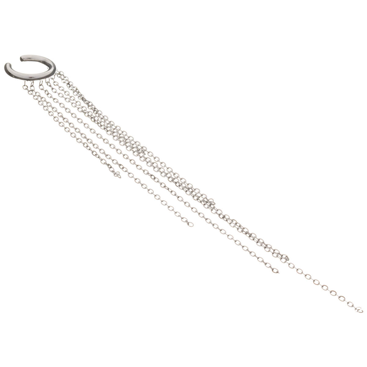 Ear cuff är ett spektakulärt smycke för brosk, som inte behöver piercas. I den här designen hänger långa kedjor i olika längder från den runda öronmanschetten. Stålet kommer inte att slitas ut vid användning. Ringen fästs på örsnibben.