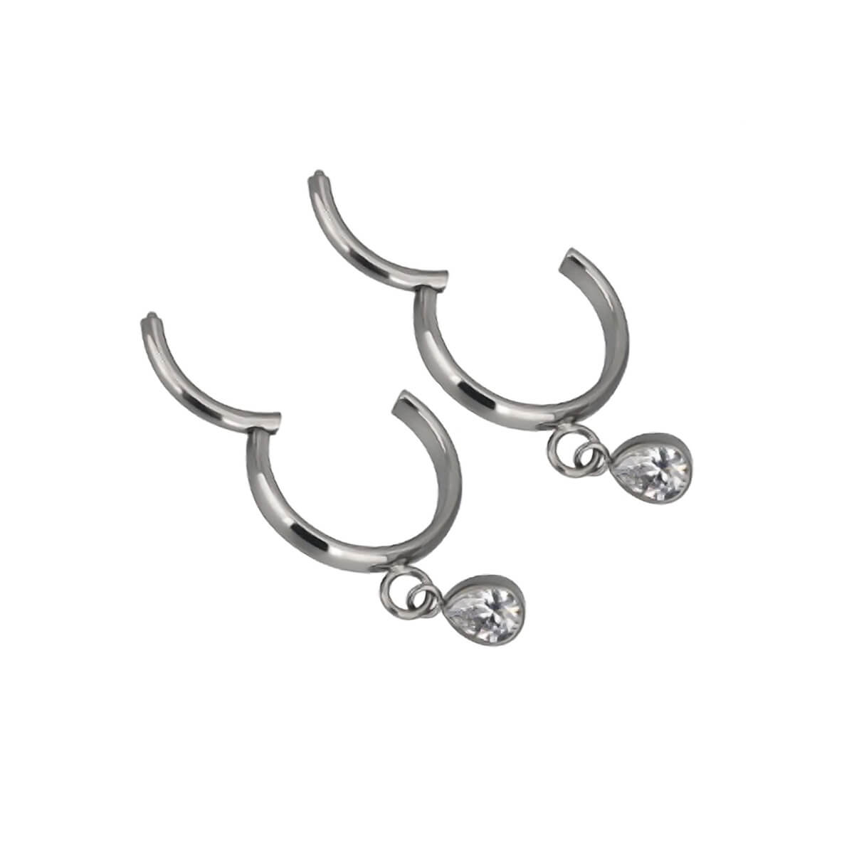 Titan är det bästa valet av material för örhängen. I den här designen dinglar en öronring i titan med en droppformad zirkoniasten. Den fina öronringen öppnas och låses med en snäpp. Smycket är helt tillverkat av titan.