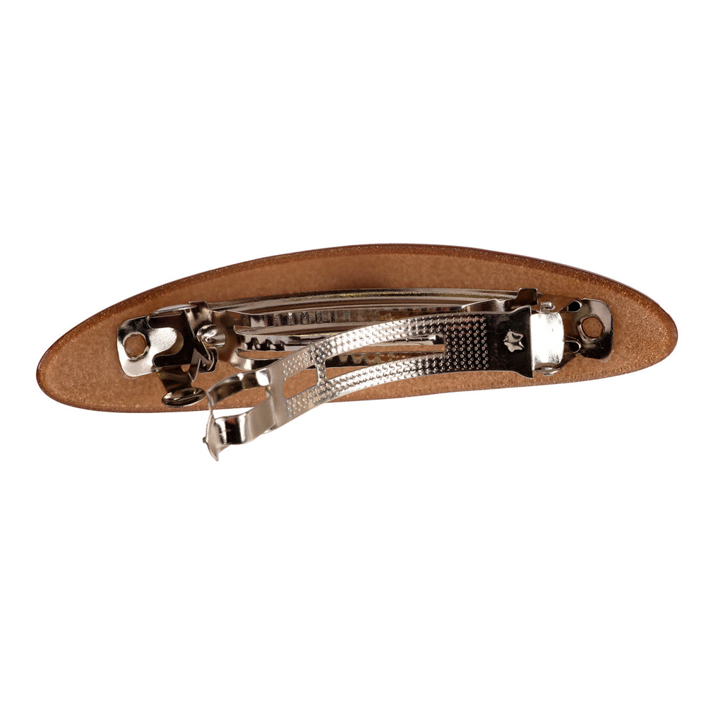Med hårspännet kan du enkelt fästa håret så att det håller sig på plats. Denna modell har ett rektangulärt plastornament ovanpå ett starkt metallspänne. Plastytan är vackert glänsande.