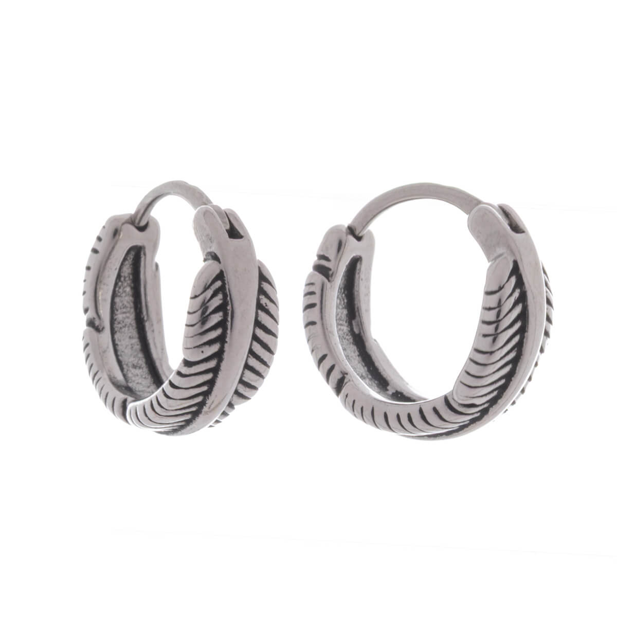 Snygga och maskulina örhängen i kirurgiskt stål med detaljerad fjädergravyr på ytan. Mönstret ger smycket ett unikt utseende utan separata hängen.