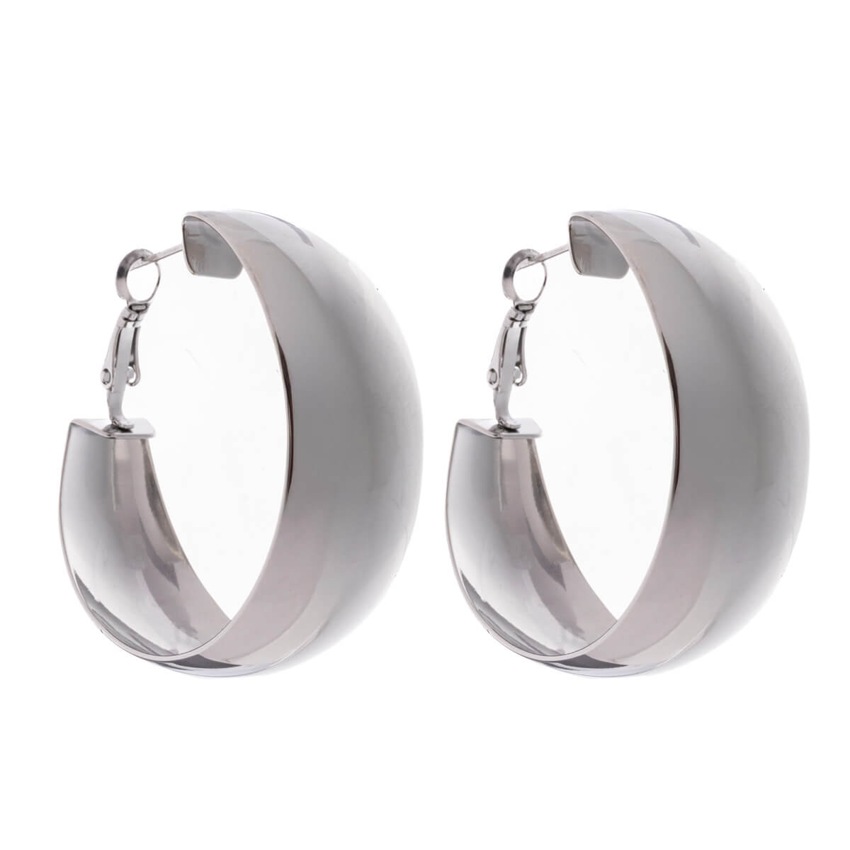 Breda örhängen i stål är snygga och hållbara. Den gångjärnsförsedda klaffen är lätt att öppna och snäppa tillbaka på örhängenas spets. Produkten är helt tillverkad av stål.